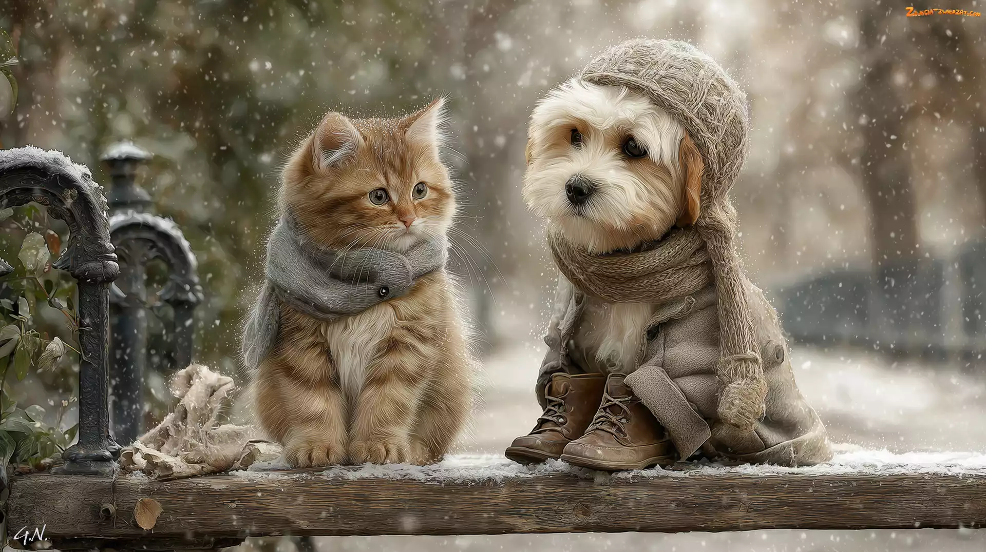 Zdjęcie: Grafika AI, Ubranka, Pies, Kot, Ławka, Zima