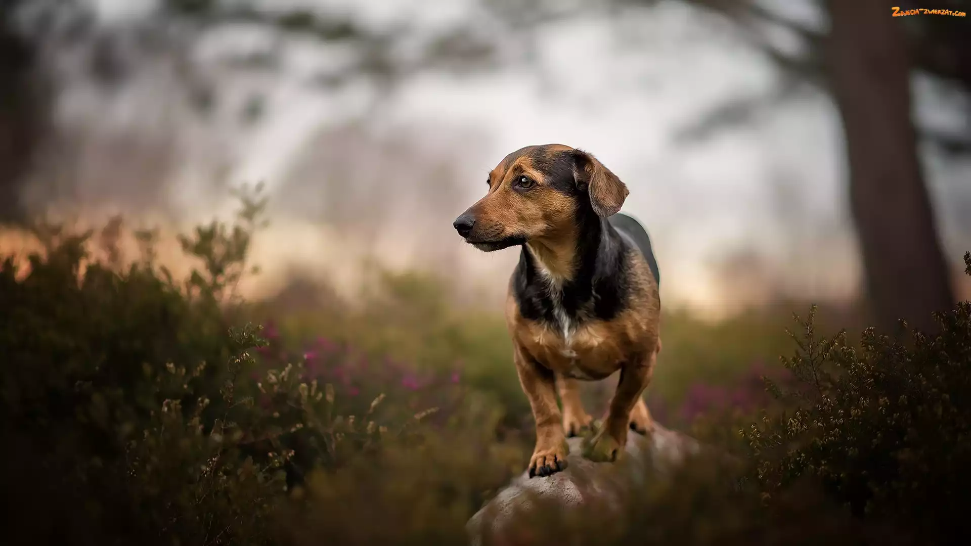 Zdjęcie: Wrzosy, Pies, Kłoda