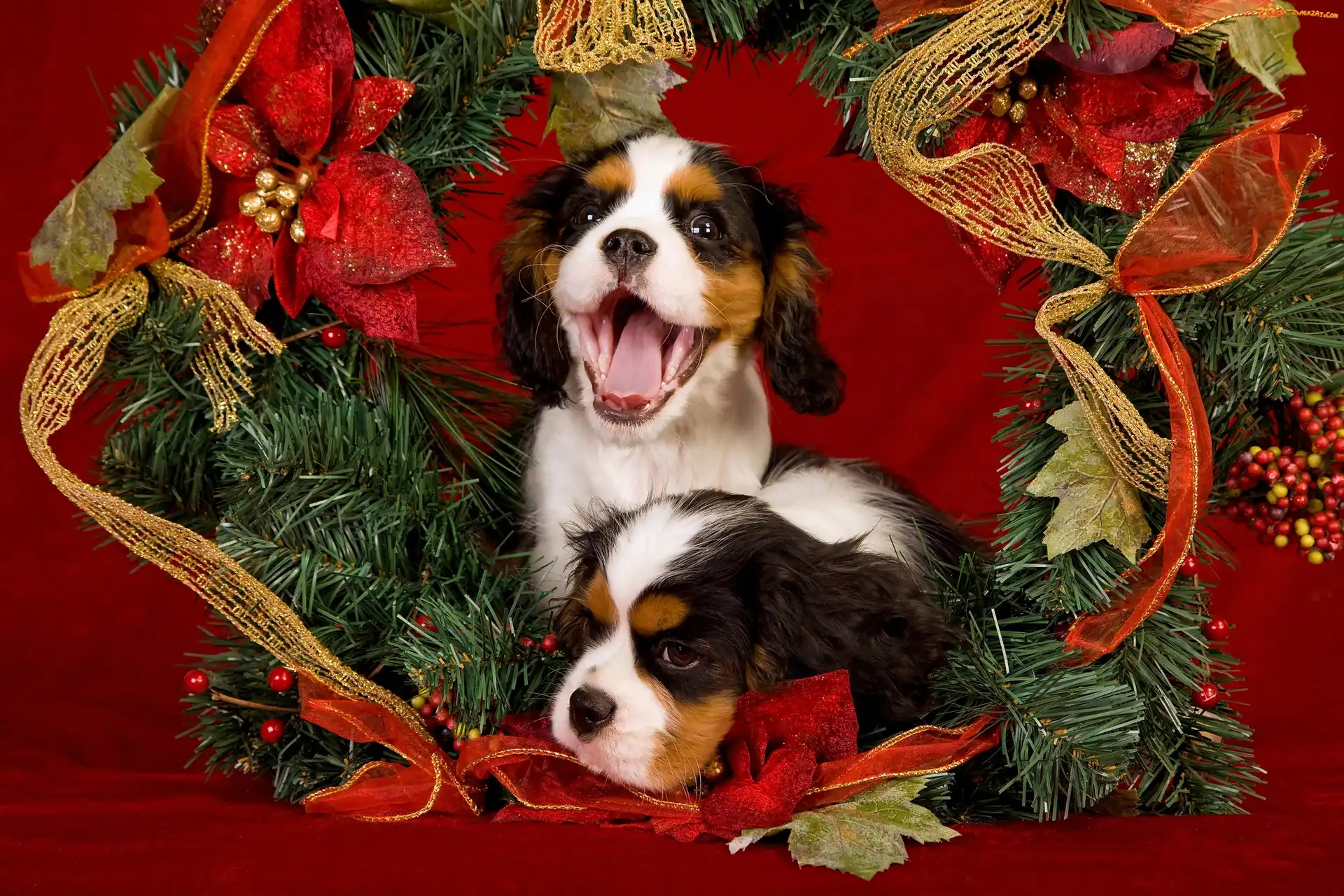 Małe, Spaniele, Trzy, Szczeniaki słodkie, Cavalier King Charles spaniel Dekoracja, Świąteczna, Szczeniaczek, Słodki, Cavalier King Charles spaniel Wieniec, Szczeniak, Cavalier king charles spaniel Cavalier King Charles spaniel, złota Mały, piesek Kapelusz, Szczeniak, Dziewczynka, Dziecko, Piesek Okno
