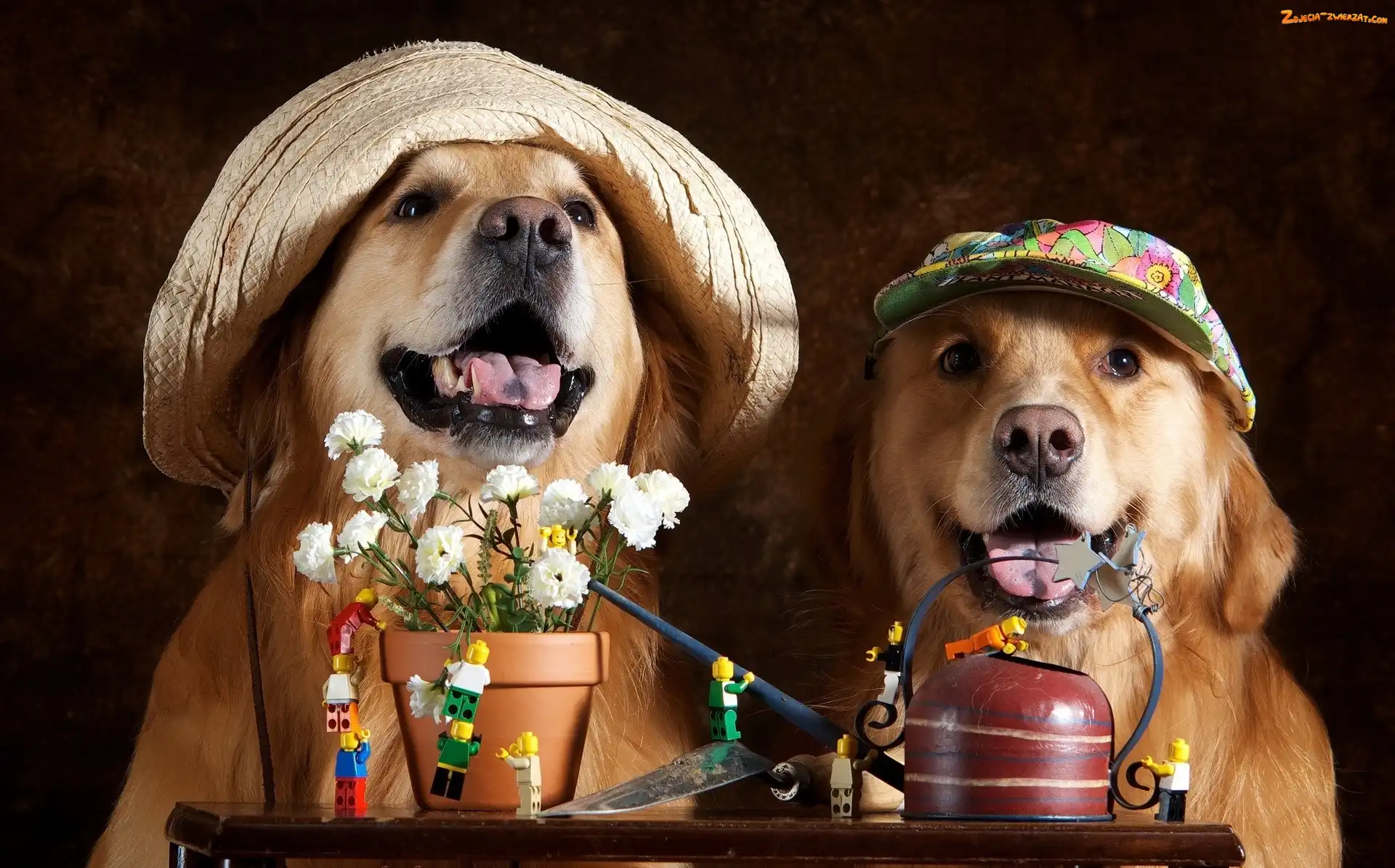 Zdjęcie: Kwiaty, Czapki, Psy, Dwa, Golden retrievery