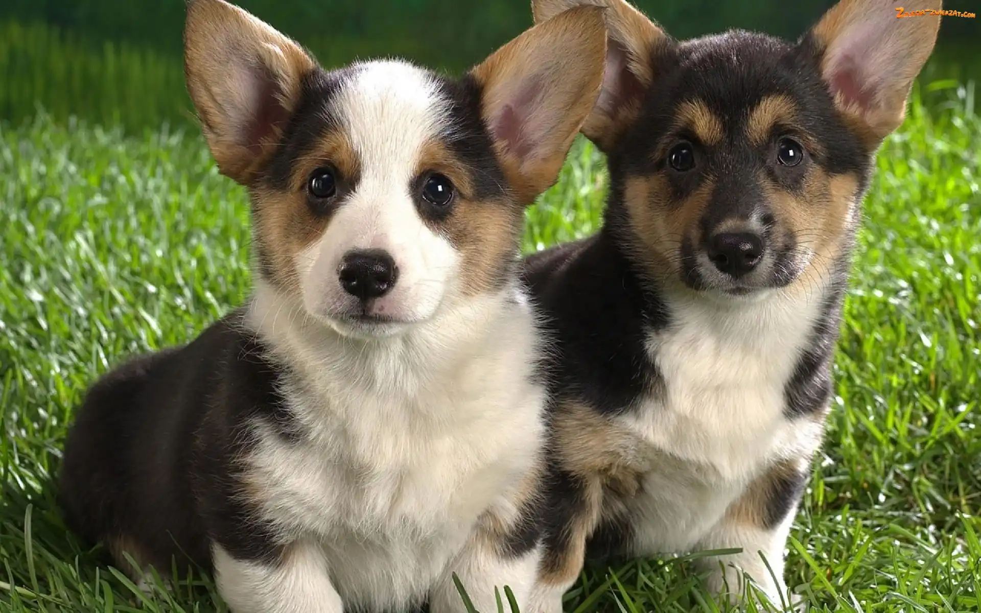 Zdjęcie: Pieski, Trawa, Dwa, Corgi