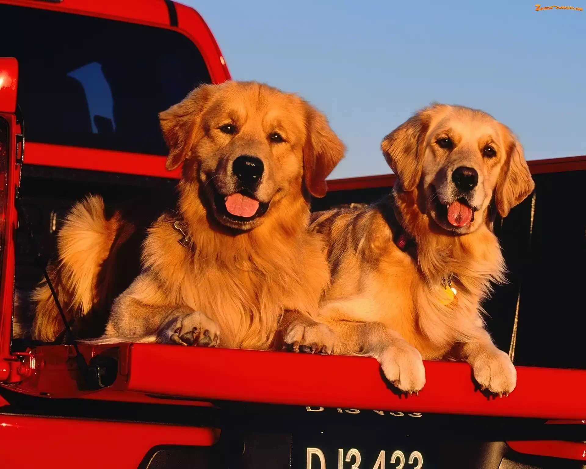 Zdjęcie: Pieski, Samochód, Dwa, Golden Retriever