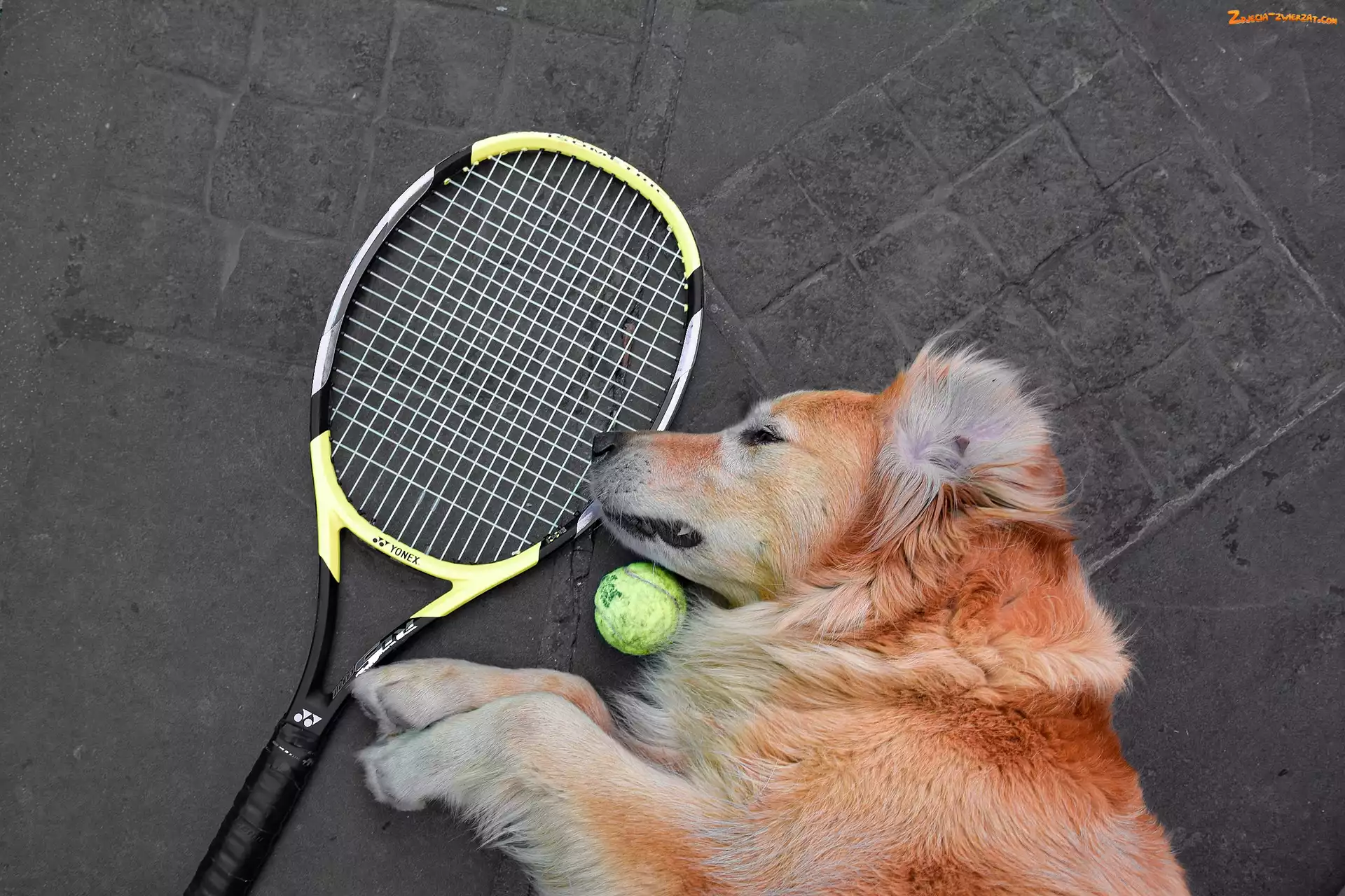 Zdjęcie: Pies, Rakieta tenisowa, Piłka