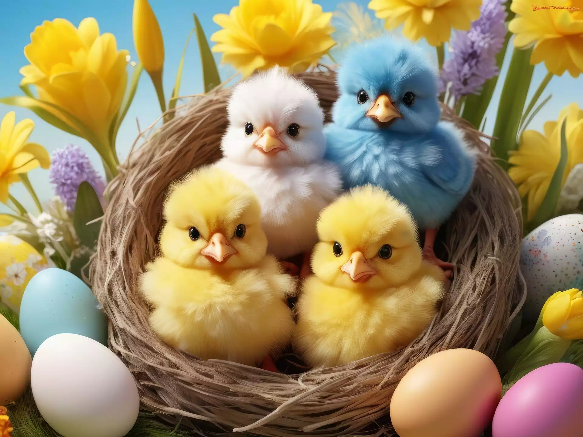 Gniazdko, Wielkanoc, Cztery, Pisklęta, Kwiaty, Kurczaczki, Pisanki