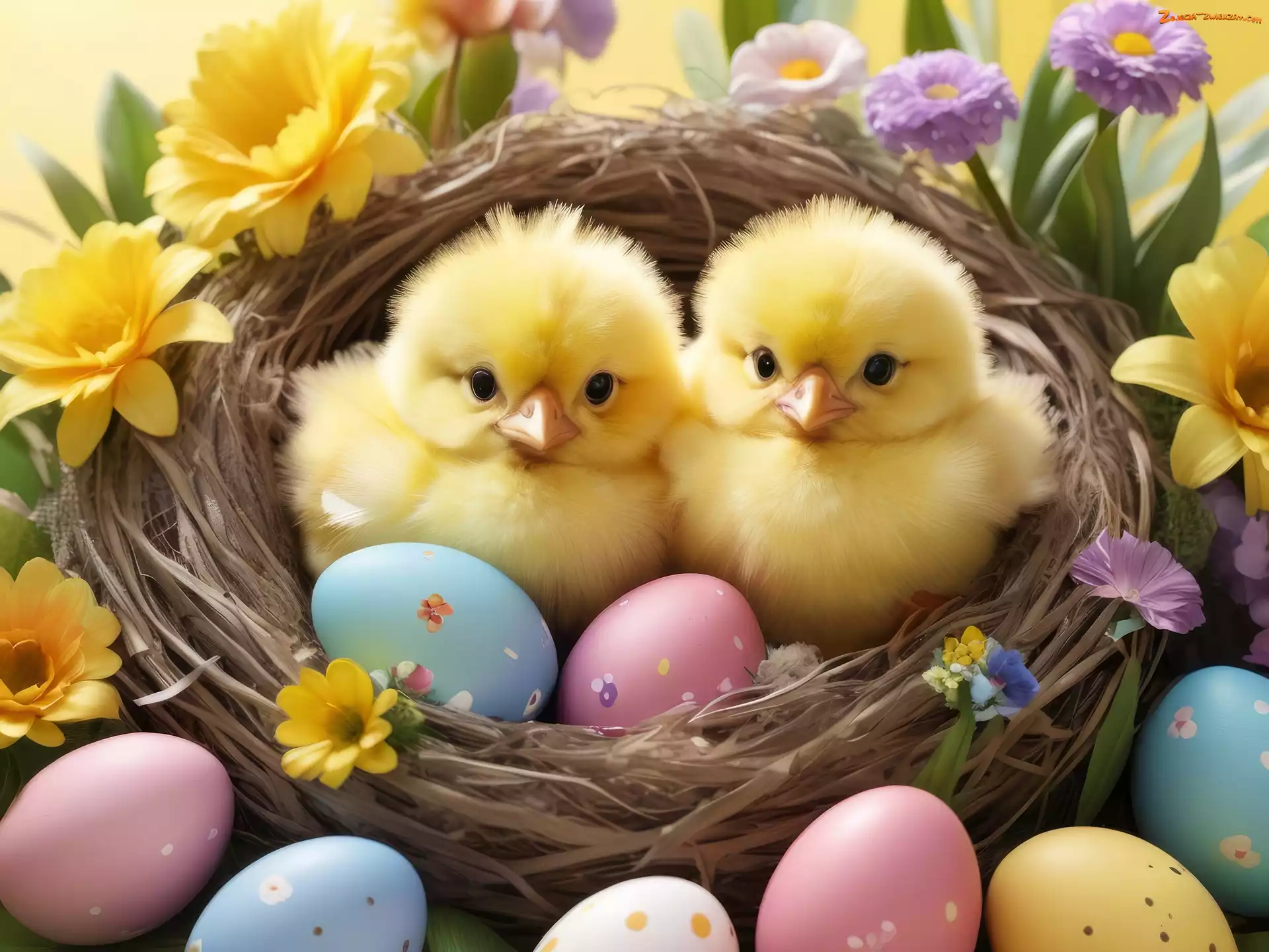 Gniazdko, Kurczęta, Wielkanoc, Pisklęta, Pisanki, Kwiaty