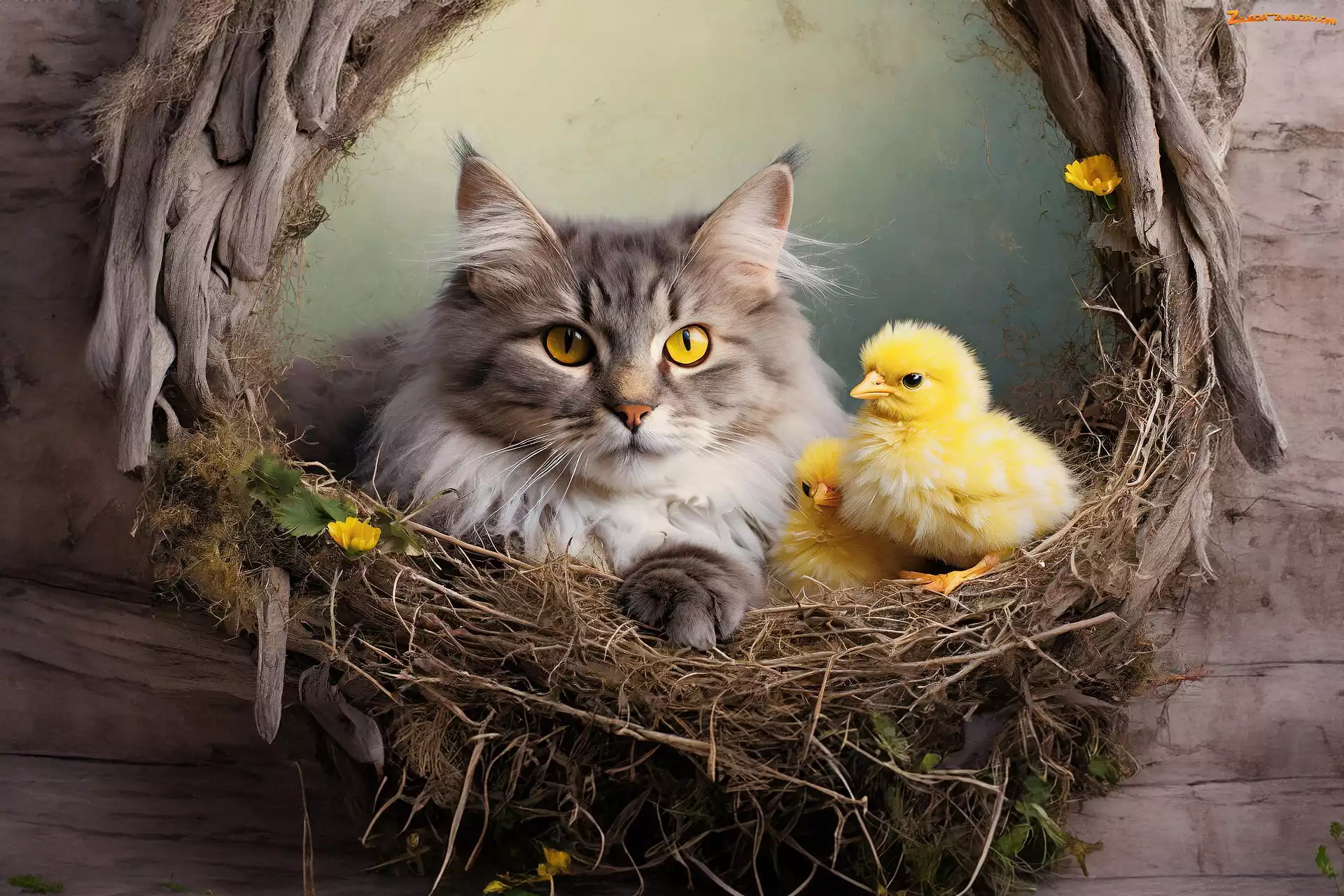 Zdjęcie: Wielkanoc, Kot, Gniazdko, Pisklęta