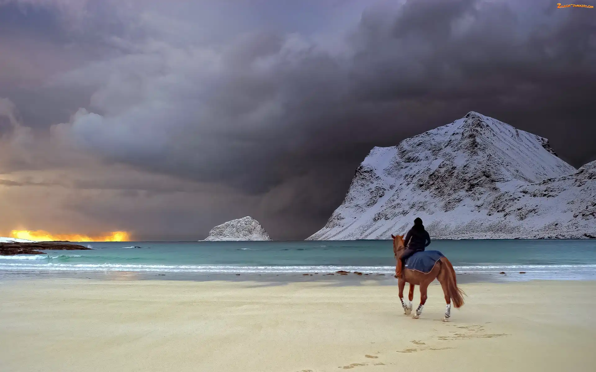 Zdjęcie: Chmury, Plaża, Mężczyzna, Ośnieżone, Góry, Koń, Morze