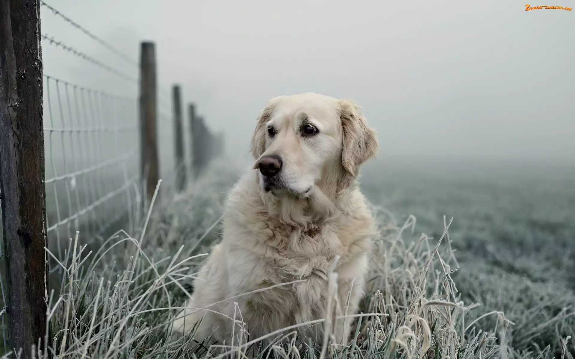 Zdjęcie: Płot, Trawa, Golden retriever, Oszroniona