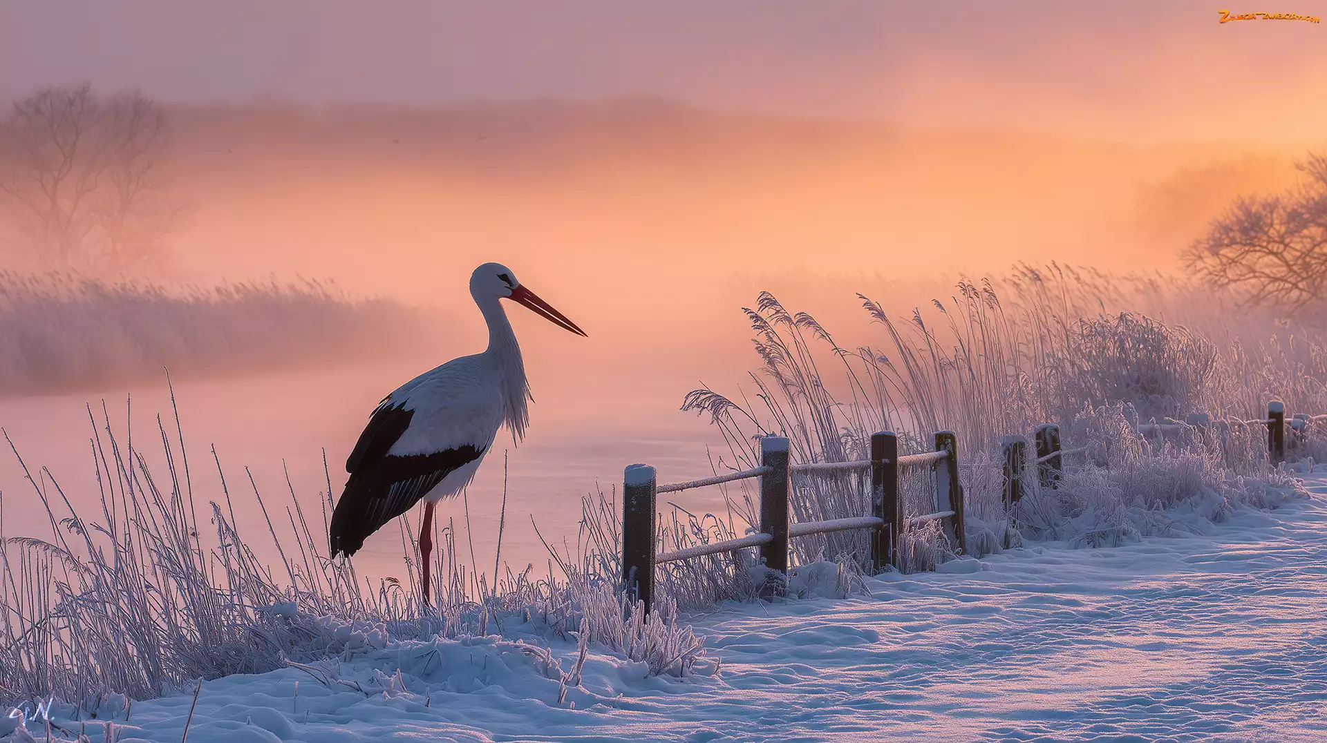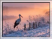 Zdjęcie: Grafika AI, Zarośla, Bocian biały, Trawy, Zima, Płot