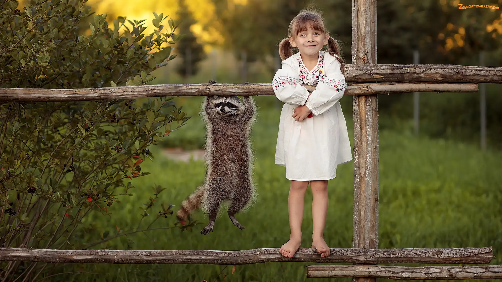 Płotek, Szop pracz, Biała, Dziewczynka, Sukienka