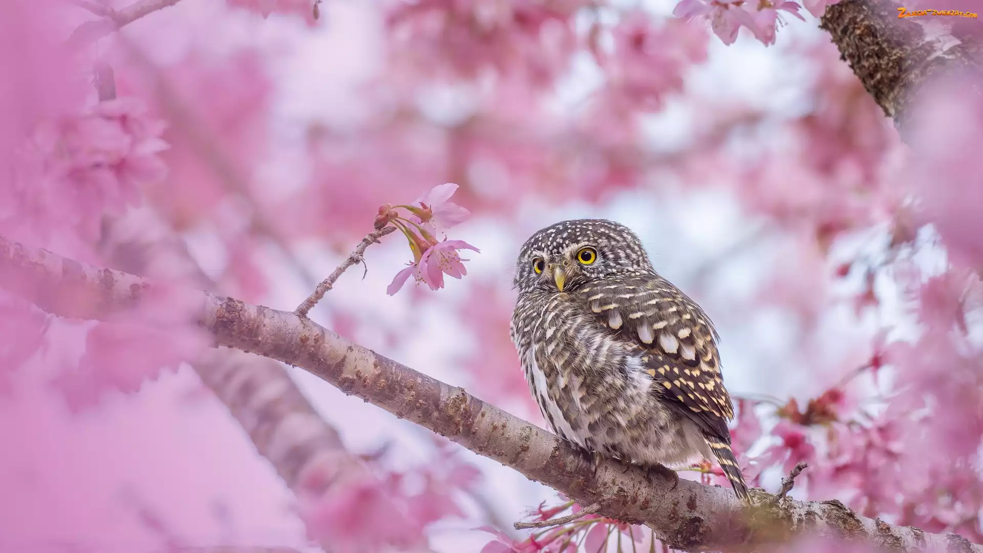 Zdjęcie: Wiosna, Ptak, Sowa, Pójdźka, Gałąź, Kwiaty