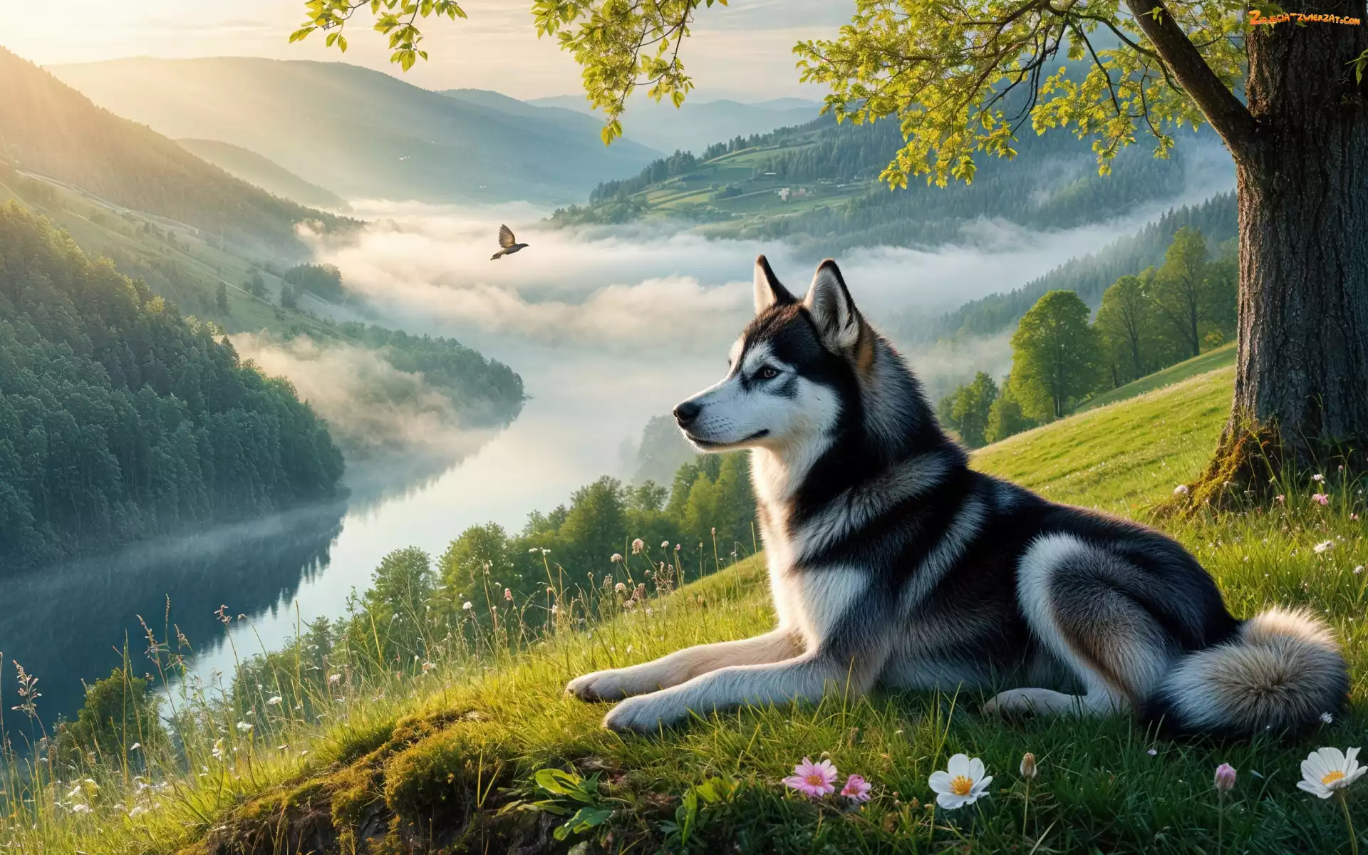 Zdjęcie: Polana, Drzewo, Pies, Góry, Siberian husky, Wzgórze, Mgła, Rzeka