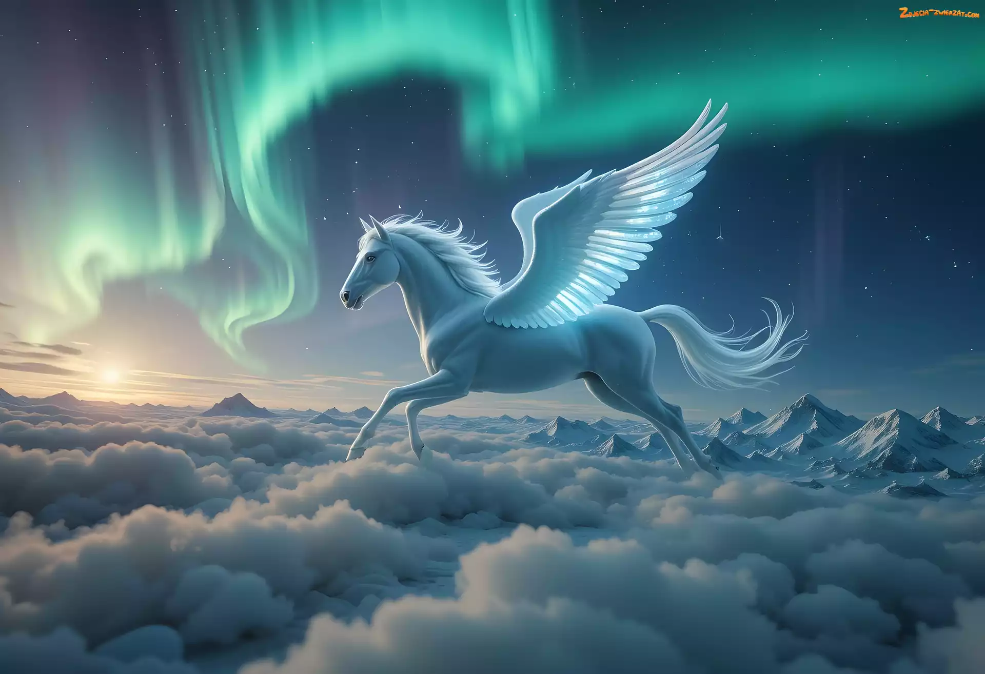 Zdjęcie: Pegaz, Fantasy, Koń, Skrzydła, Chmury, Biały, Zorza polarna