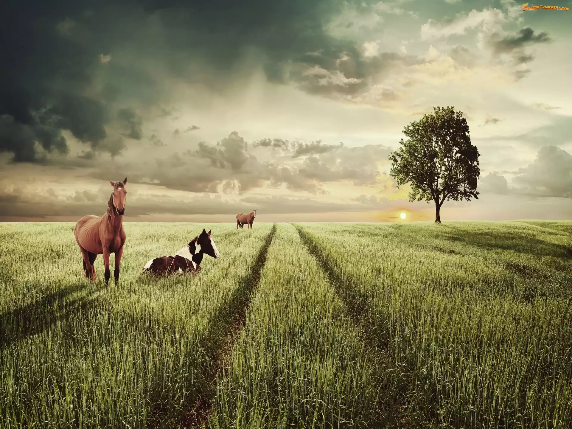 Pole, Słońce, Konie, Drzewo