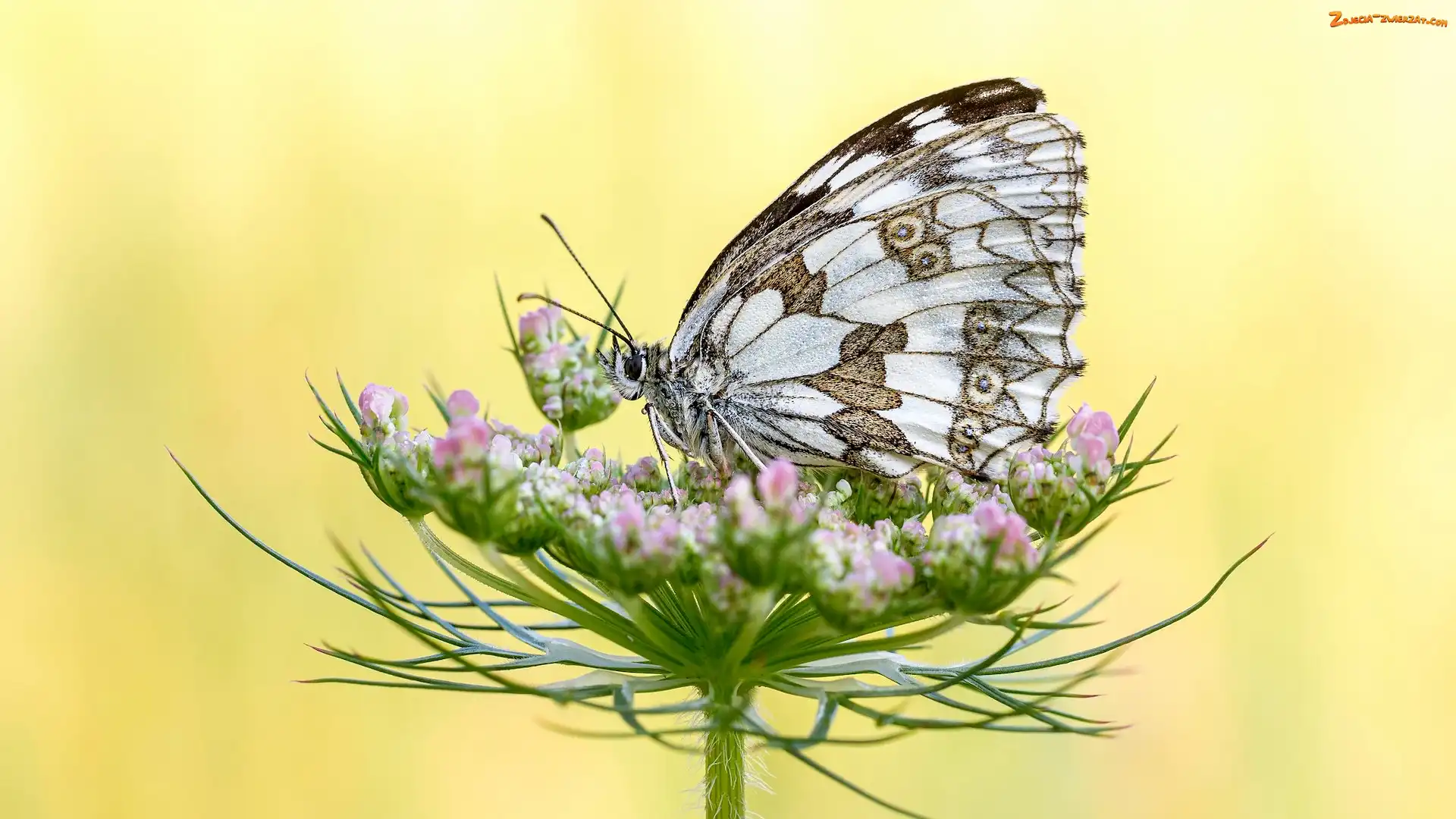 Zdjęcie: Polowiec szachownica, Żółte tło, Motyl, Roślina