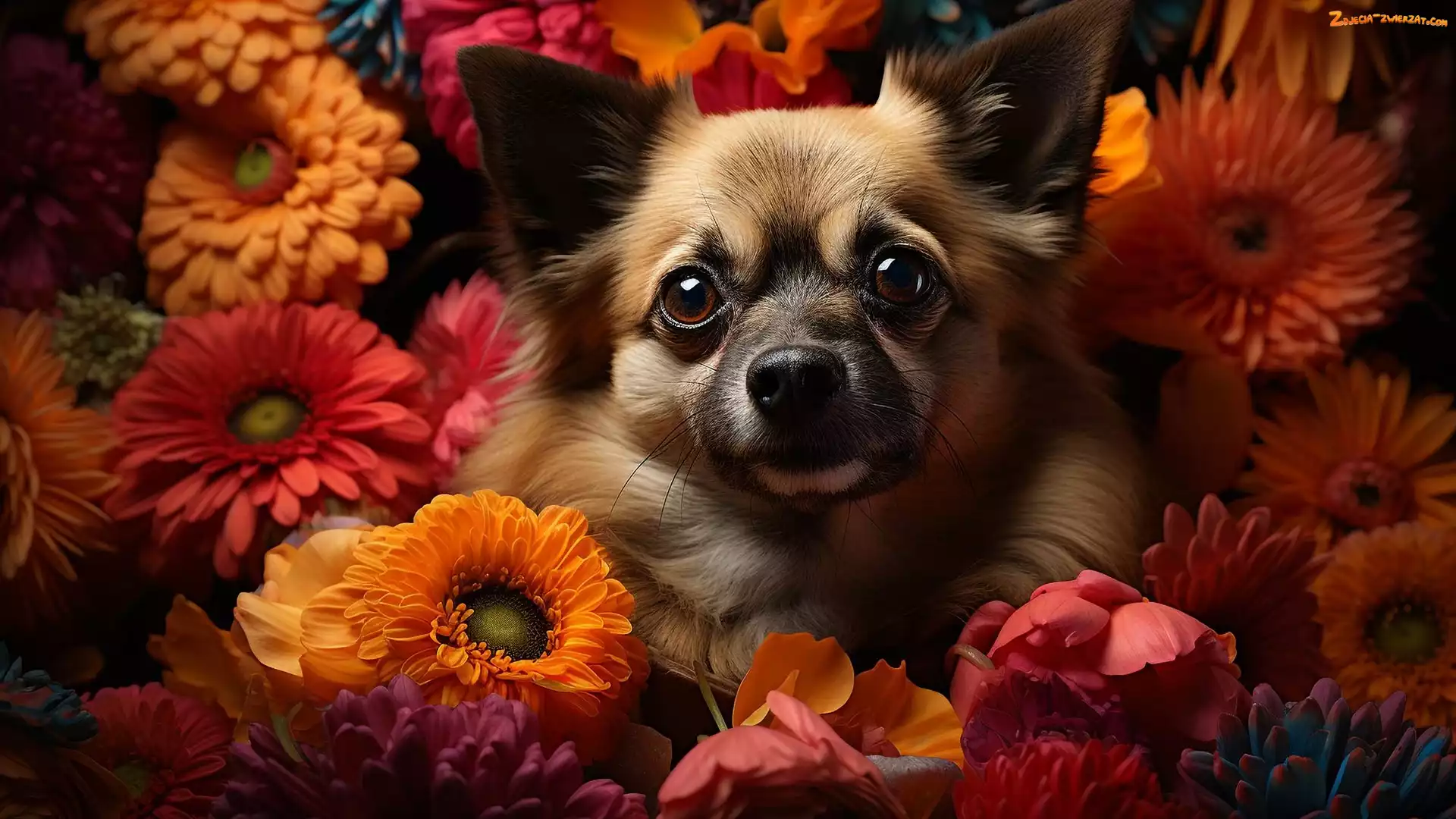 Zdjęcie: Pies, Mordka, Kwiaty, Pomarańczowe