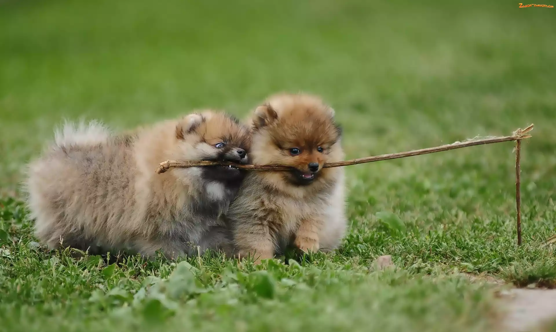 Zdjęcie: Zabawa, Szpice miniaturowe, Dwa, Łąka, Patyk, Szczeniaki, Pomeraniany
