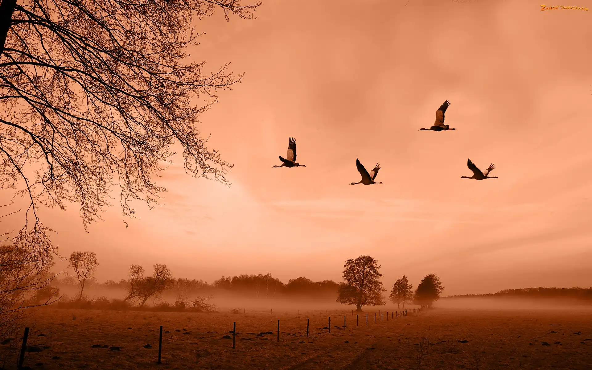 Poranek, Mgła, Niebo, Ptaki, Drzewa
