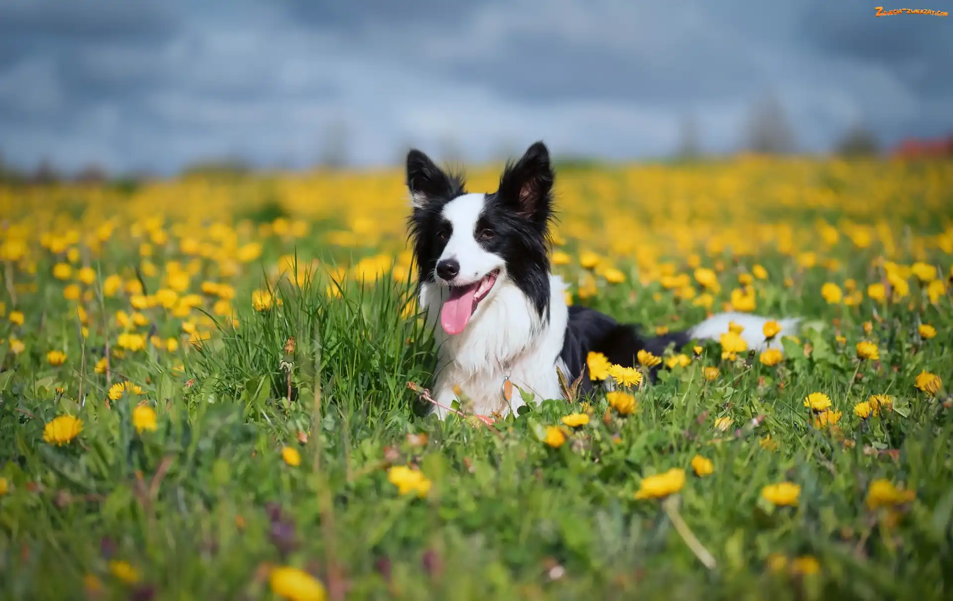 Mniszek pospolity, Trawa, Border collie, Pies, Łąka
