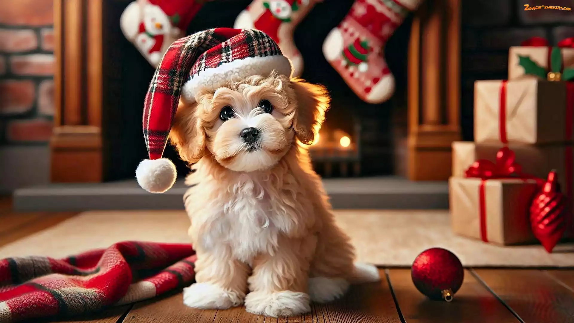 Zdjęcie: Prezenty, Boże Narodzenie, Bombka, Grafika, Koc, Pies, Czapka, Szczeniak