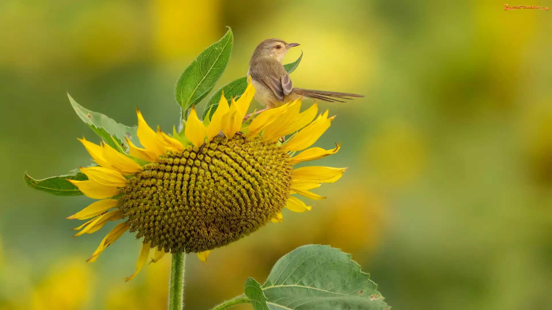 Zdjęcie: Prinia, Słonecznik, Ptak, Kwiat