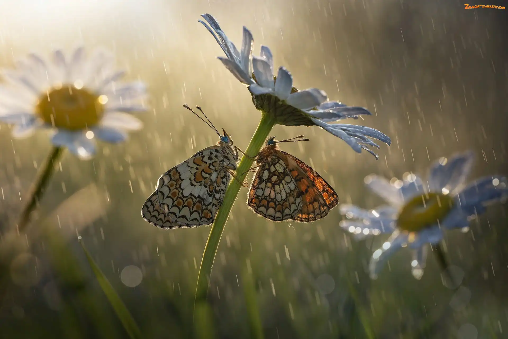 Zdjęcie: Przeplatki, Deszcz, Motyle, Margerytki