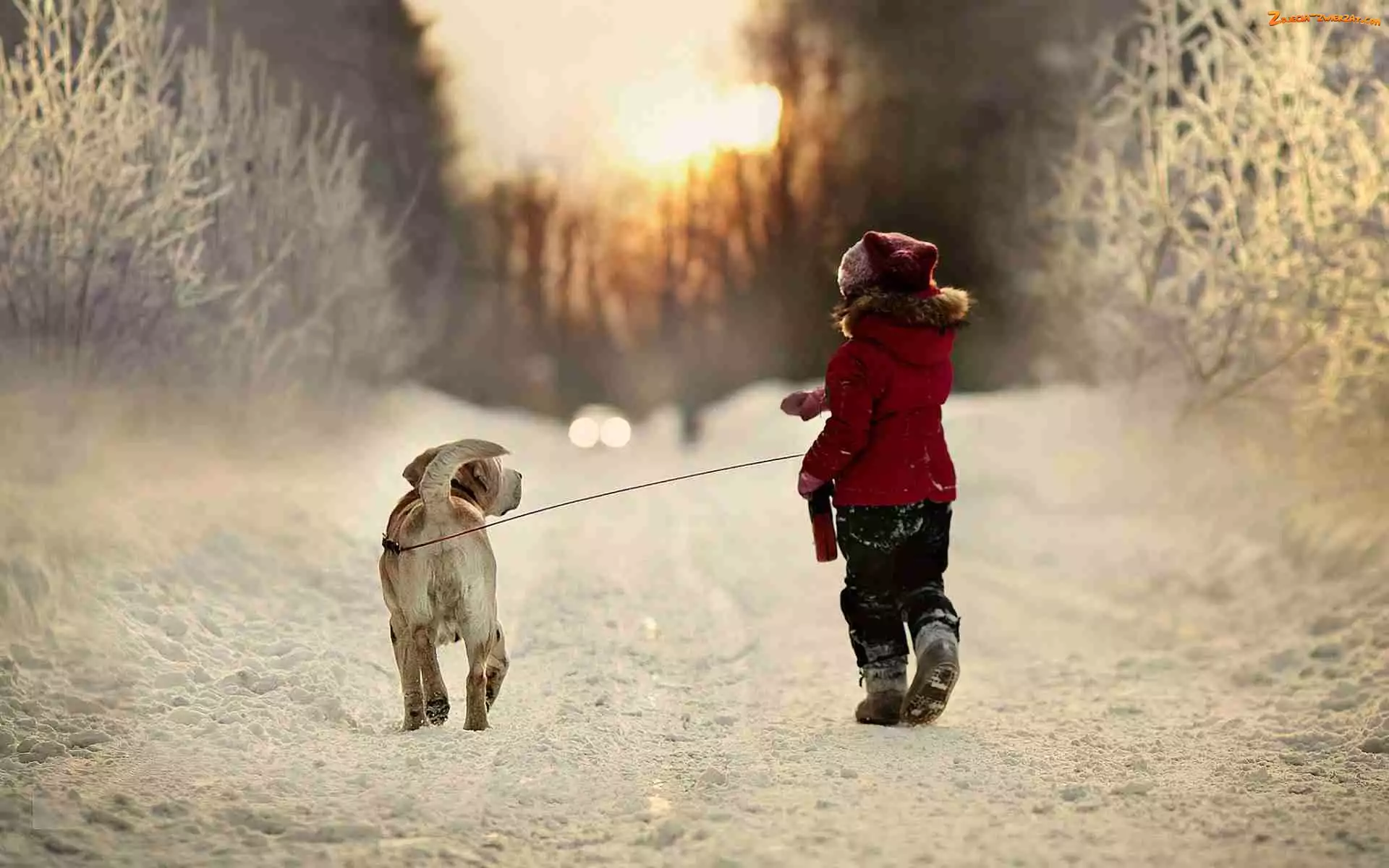 Zdjęcie: Zima, Psem, Dziewczynka, Droga, Las, Z, Spacer