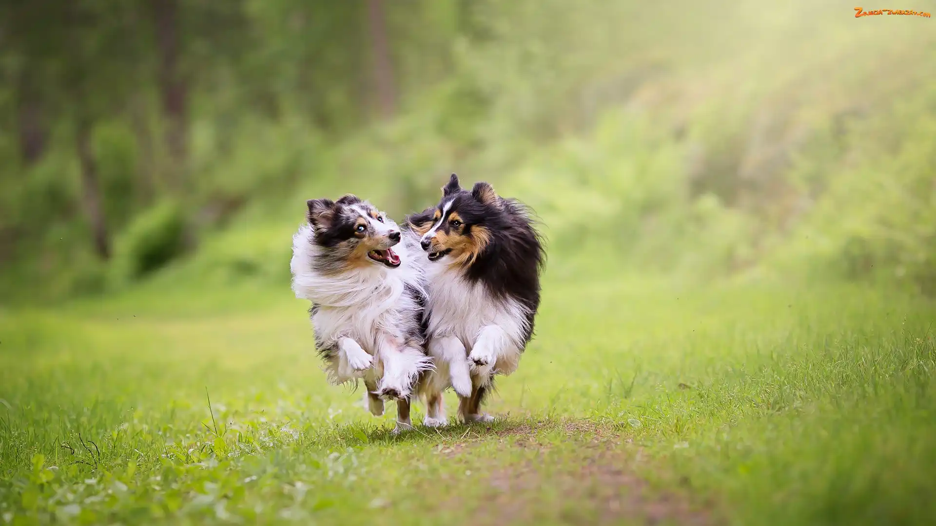 Zdjęcie: Biegnące, Psy, Trawa, Polana, Dwa, Owczarki szetlandzkie