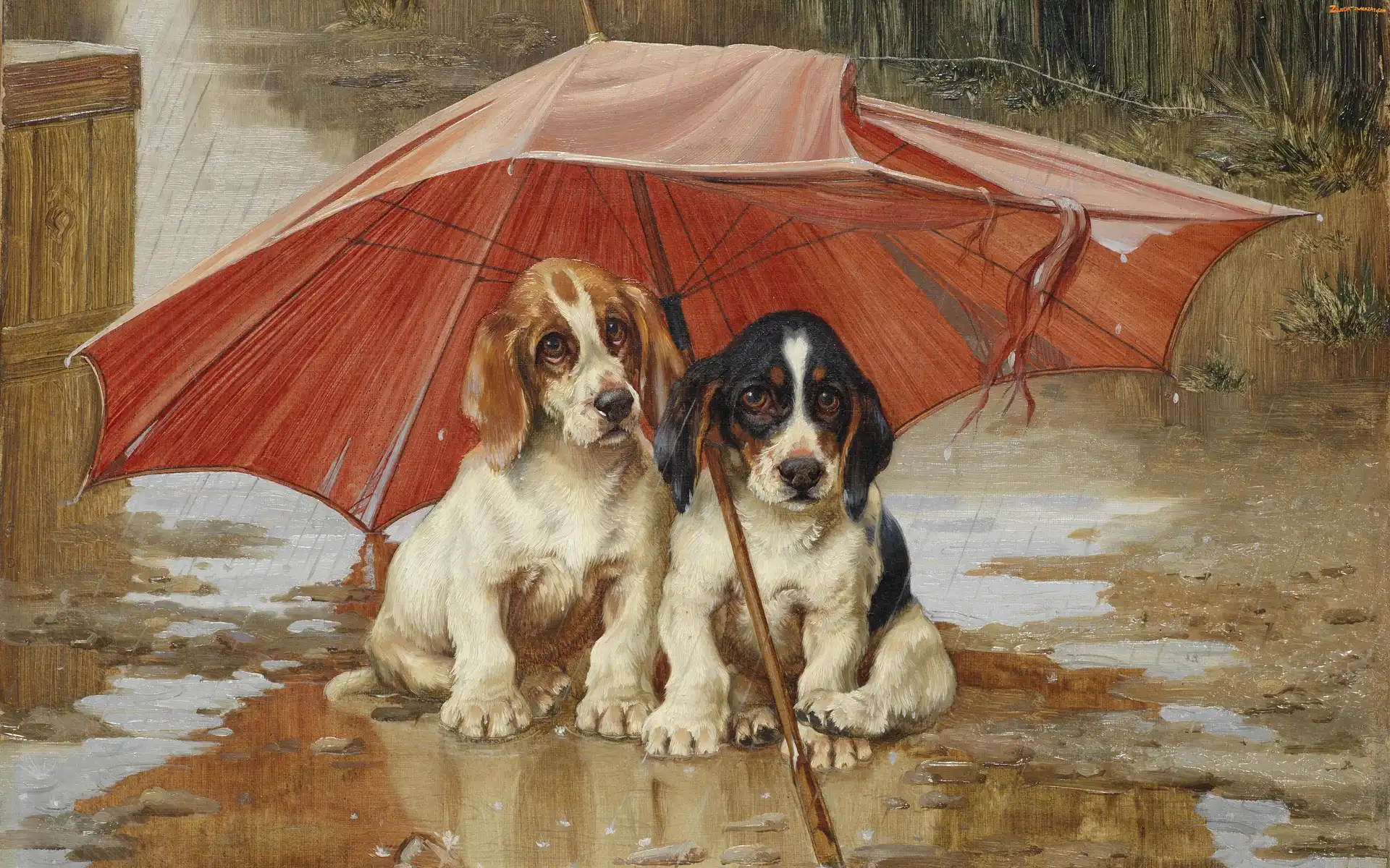 Zdjęcie: Kałuża, Wiliam Henry Hamilton Trood, Malarstwo, Deszcz, Parasol, Obraz, Psy