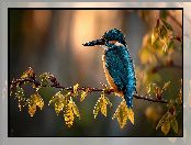 Grafika AI, Gałązka, Ptak, Zimorodek, Młode, Listki