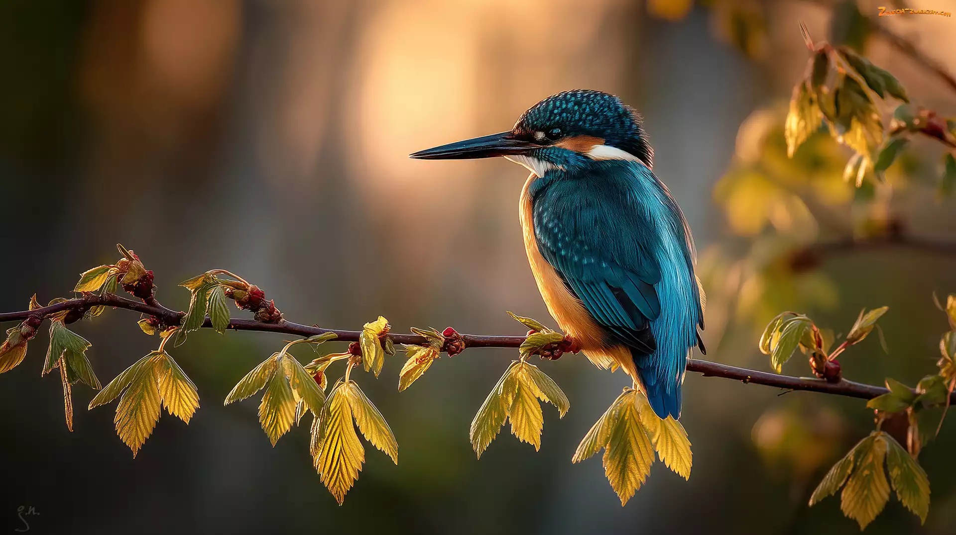 Zdjęcie: Grafika AI, Gałązka, Ptak, Zimorodek, Młode, Listki