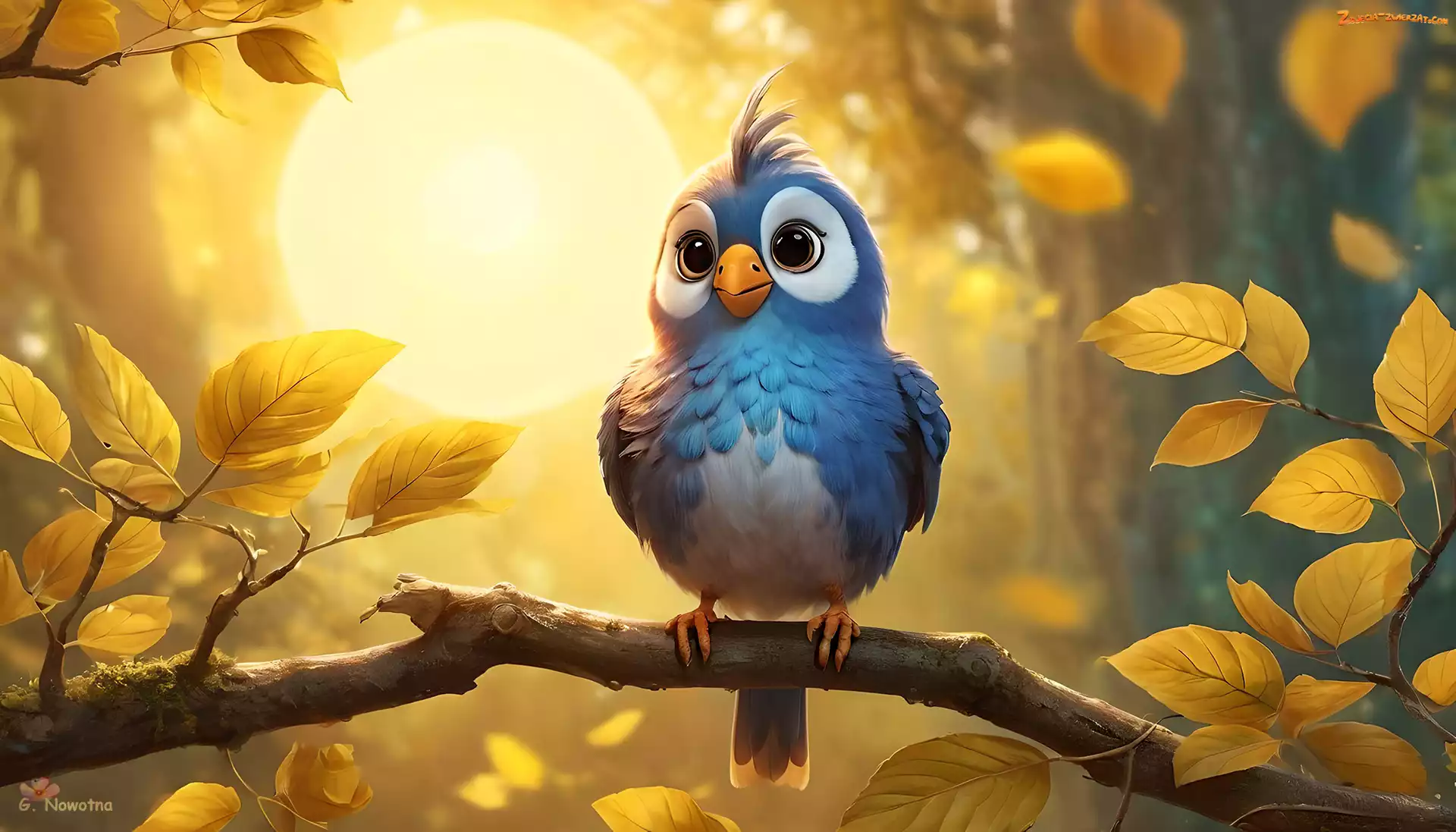 Zdjęcie: Grafika, Żółte, Niebieski, Ptak, Liście, Gałązka