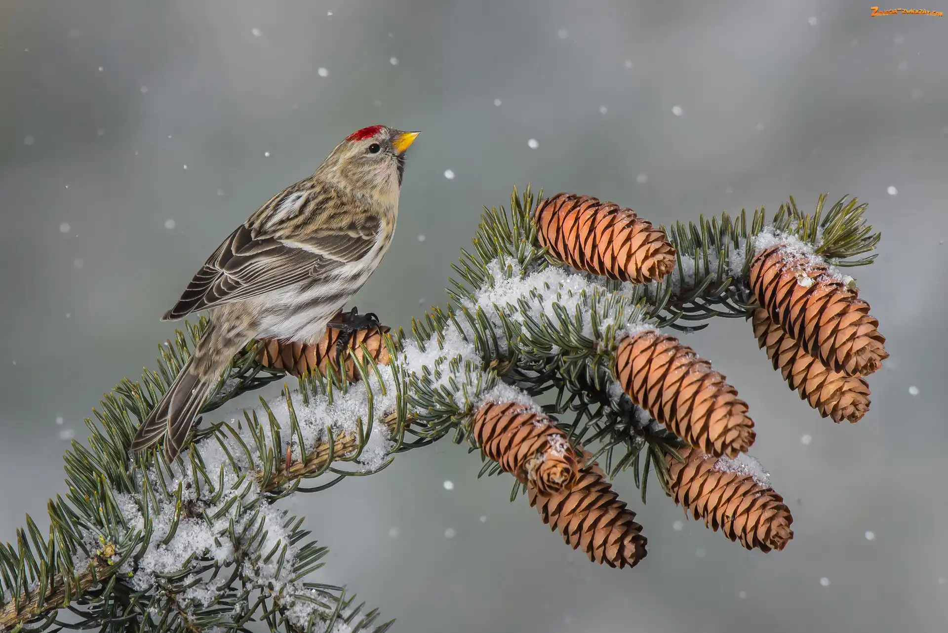 Zdjęcie: Gałązka, Ptak, Śnieg, Szyszki, Czeczotka zwyczajna, Świerk