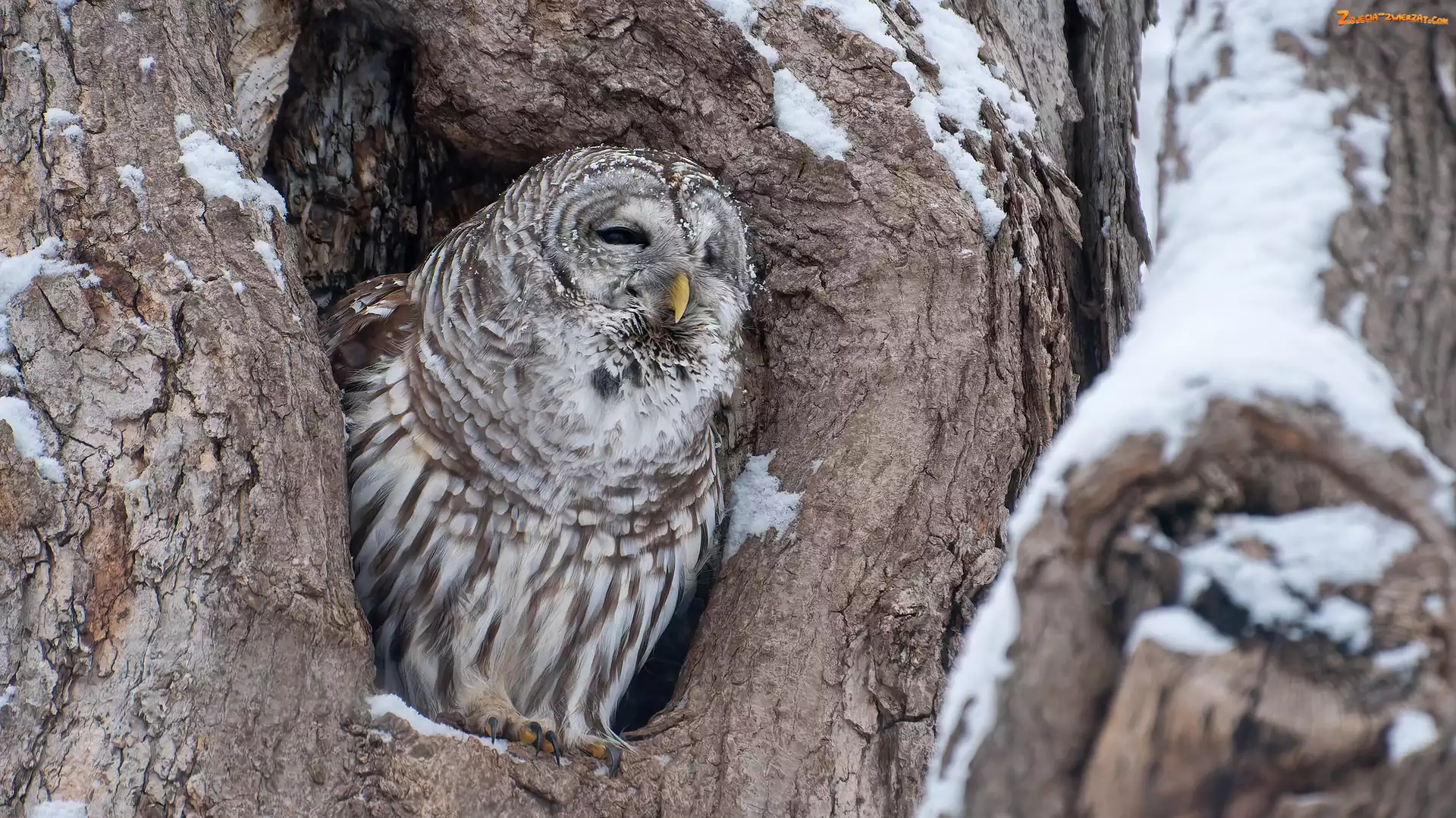 Zdjęcie: Śnieg, Puszczyk kreskowany, Ptak, Sowa, Drzewo, Dziupla
