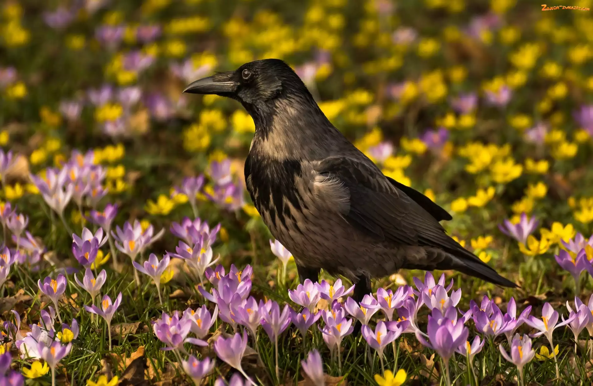Zdjęcie: Krokusy, Ptak, Kruk