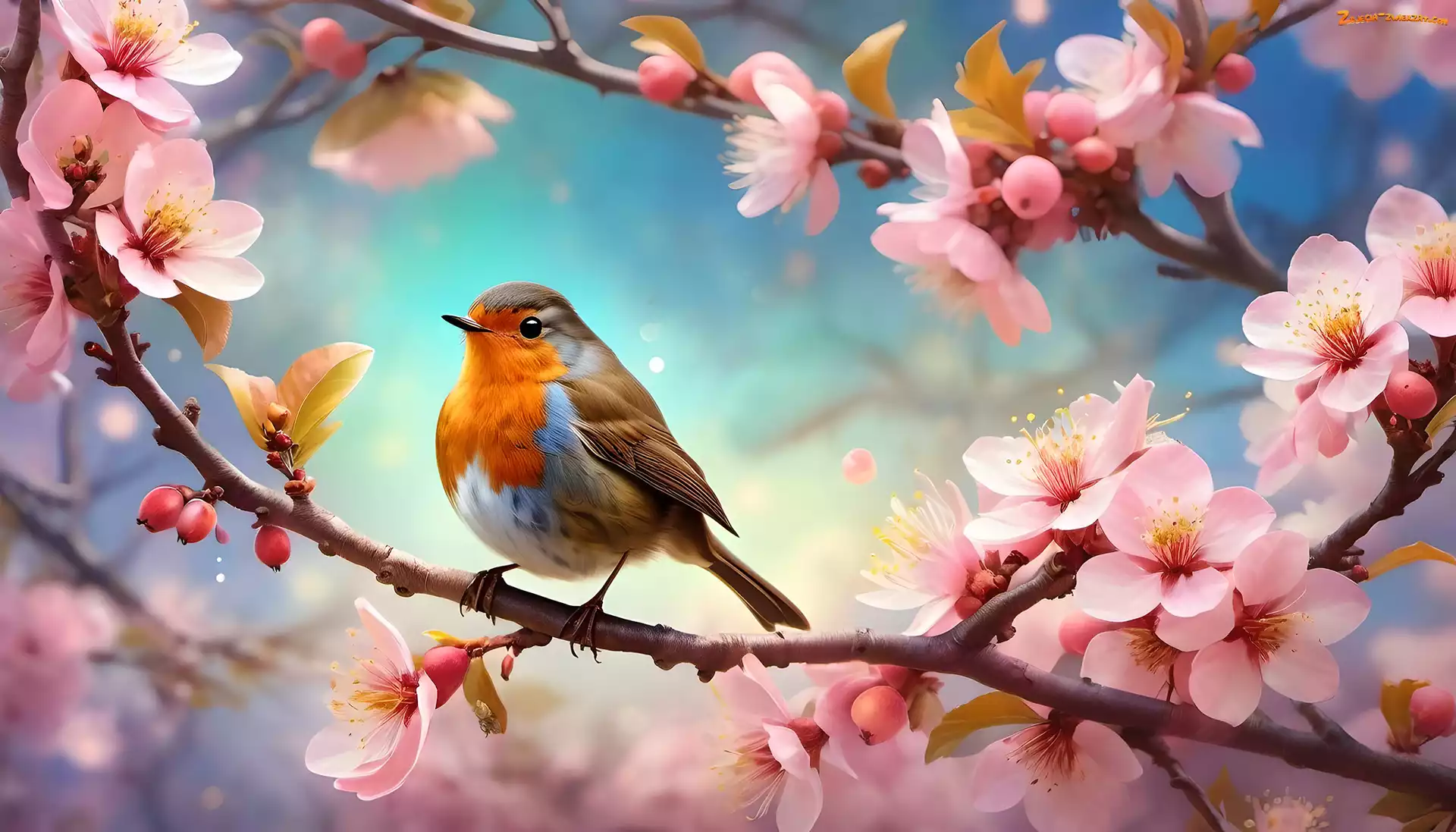 Zdjęcie: Grafika, Gałąź, Rudzik, Ptak, Różowe, Kwiaty