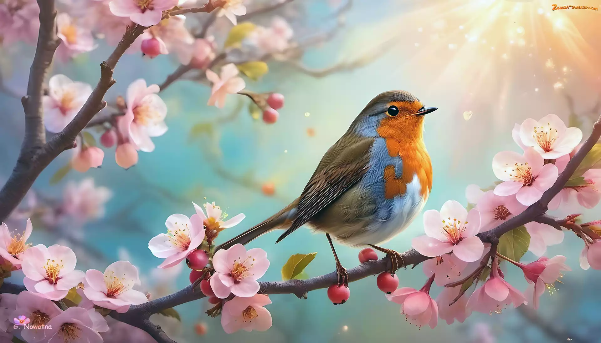 Zdjęcie: Grafika, Gałązka, Rudzik, Ptak, Różowe, Kwiaty