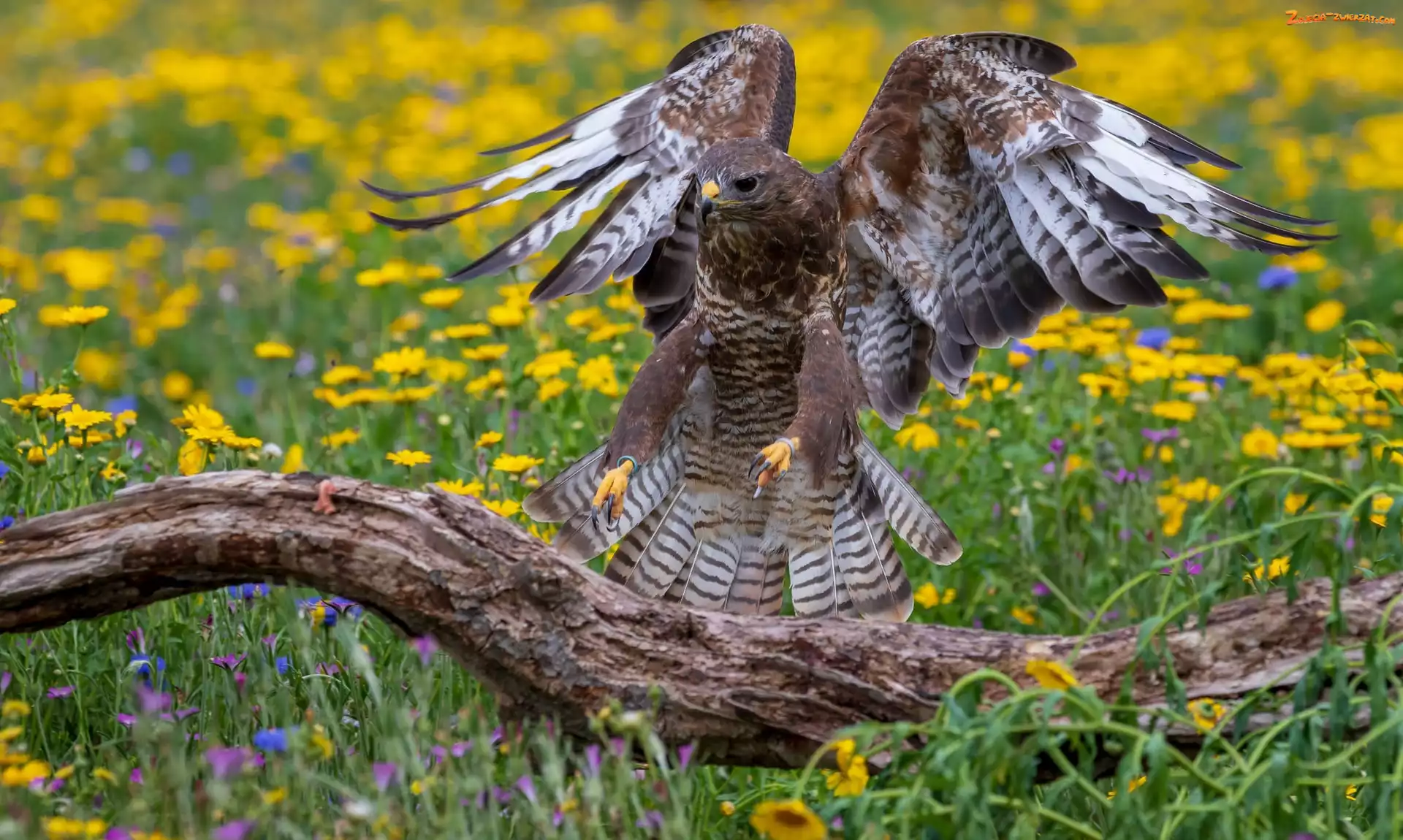 Zdjęcie: Łąka, Kwiaty, Sokół, Ptak, Konar