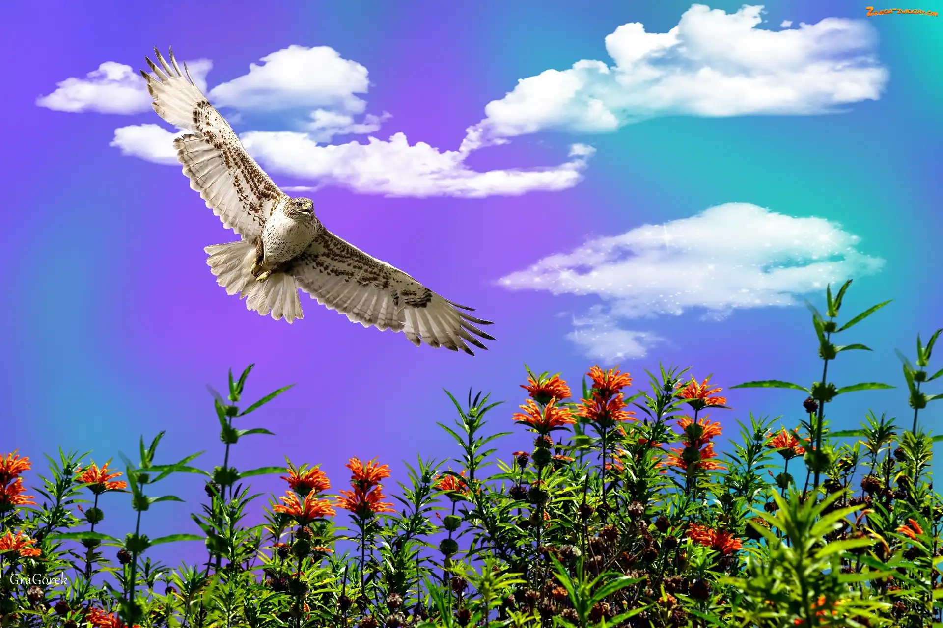 Łąka, Niebo, Drapieżny ptak, Kwiaty