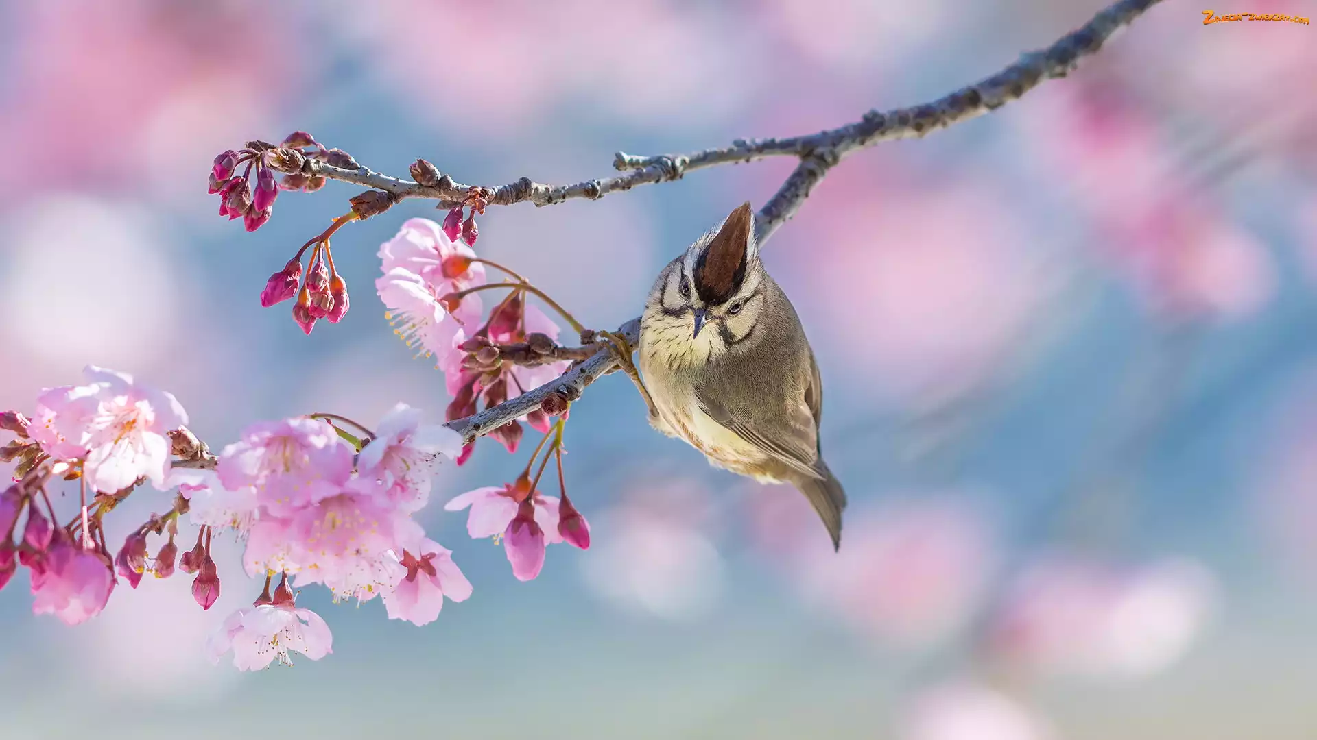 Zdjęcie: Gałązka, Ptak, Kwiaty, Różowe, Czupurnik białolicy, Drzewo owocowe