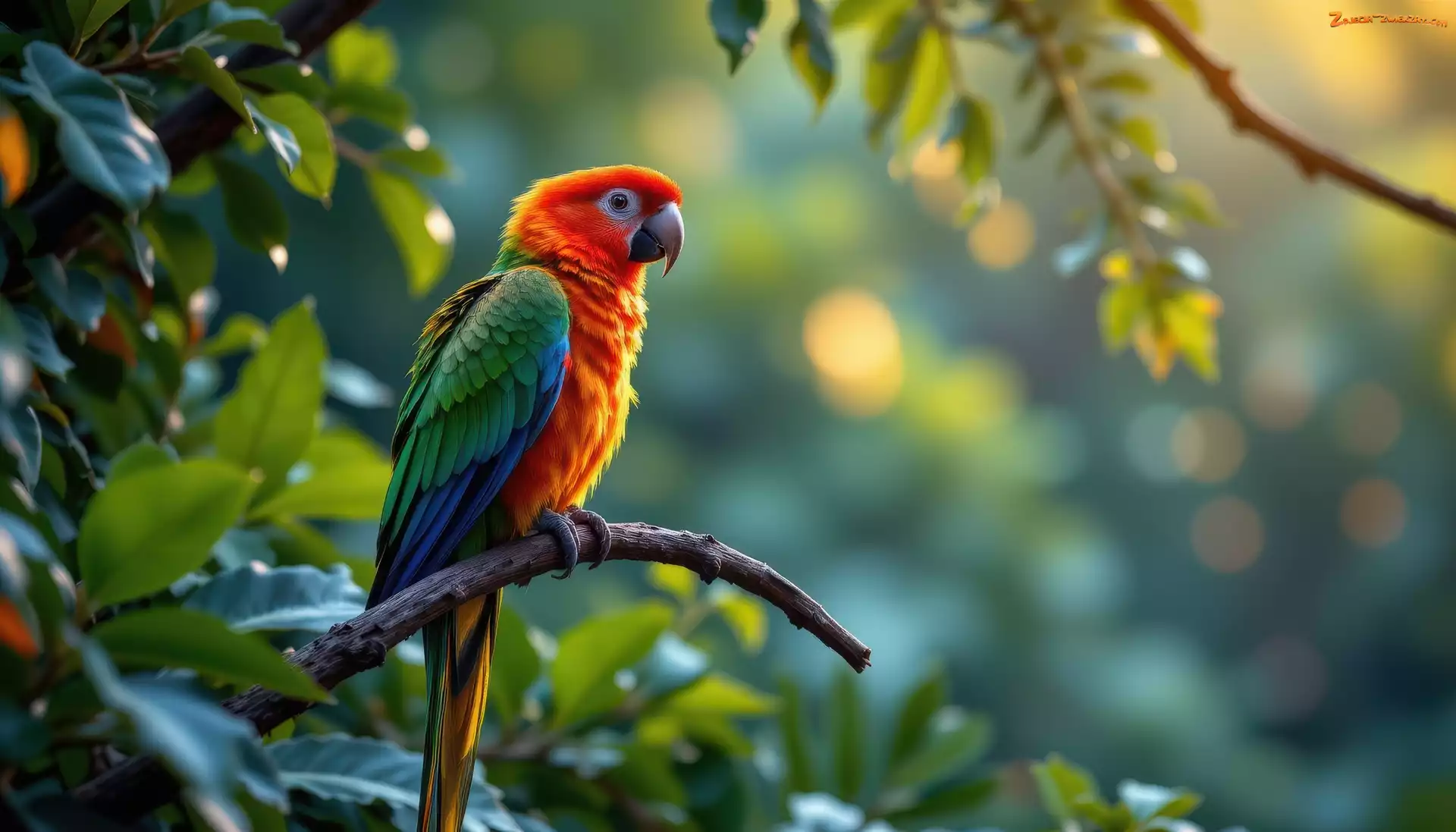 Zdjęcie: Grafika AI, Papuga, Ptak, Kolorowa, Gałązka, Liście