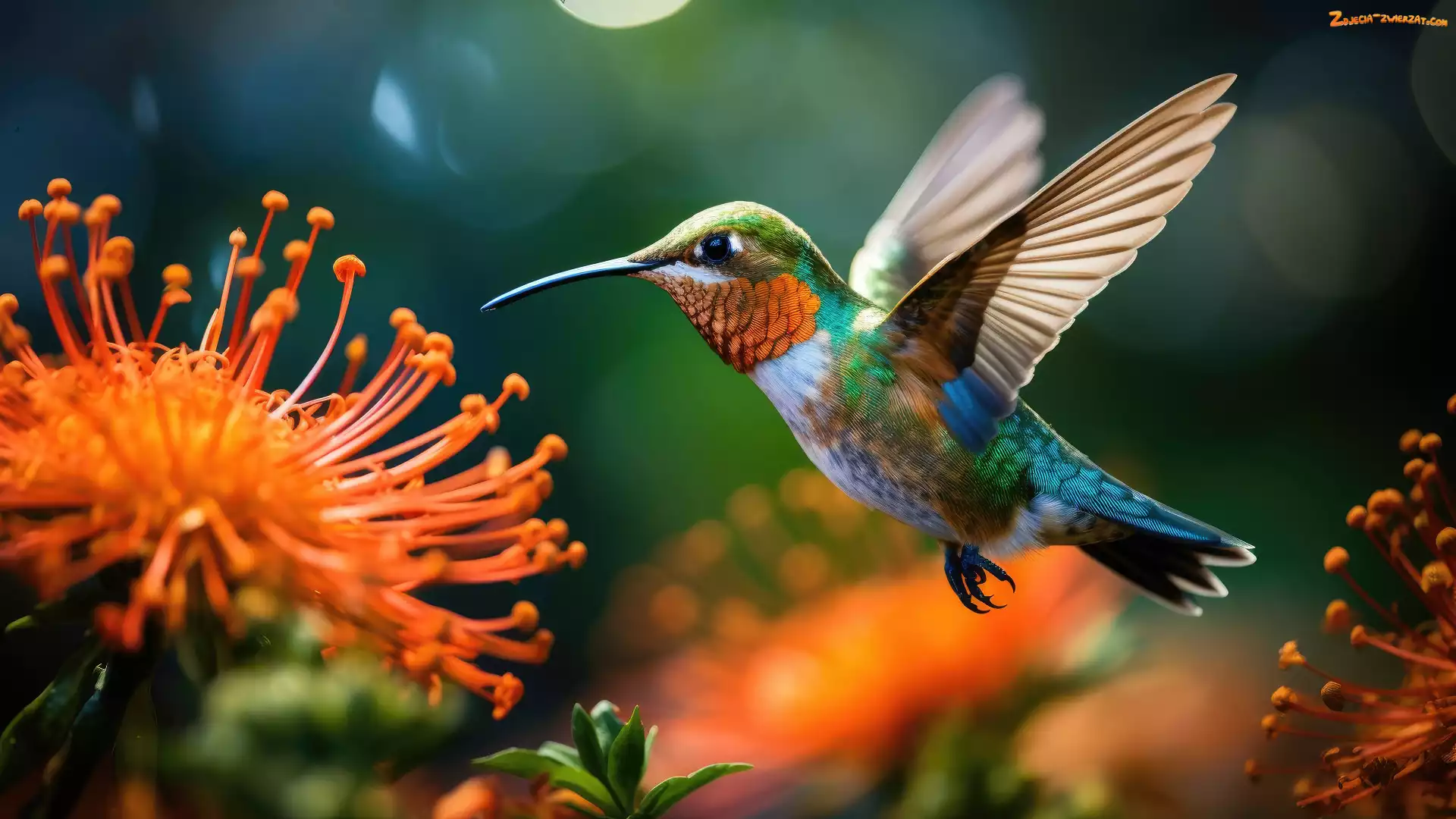 Zdjęcie: Zielone tło, Skrzydła, Ptak, Koliber, Pomarańczowe, Kwiaty