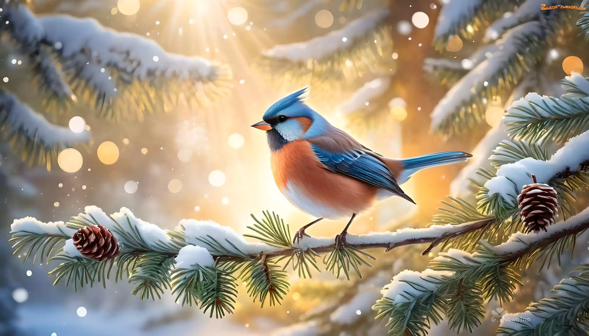 Zdjęcie: Grafika, Gałązka, Kolorowy, Ptak, Świerk, Śnieg
