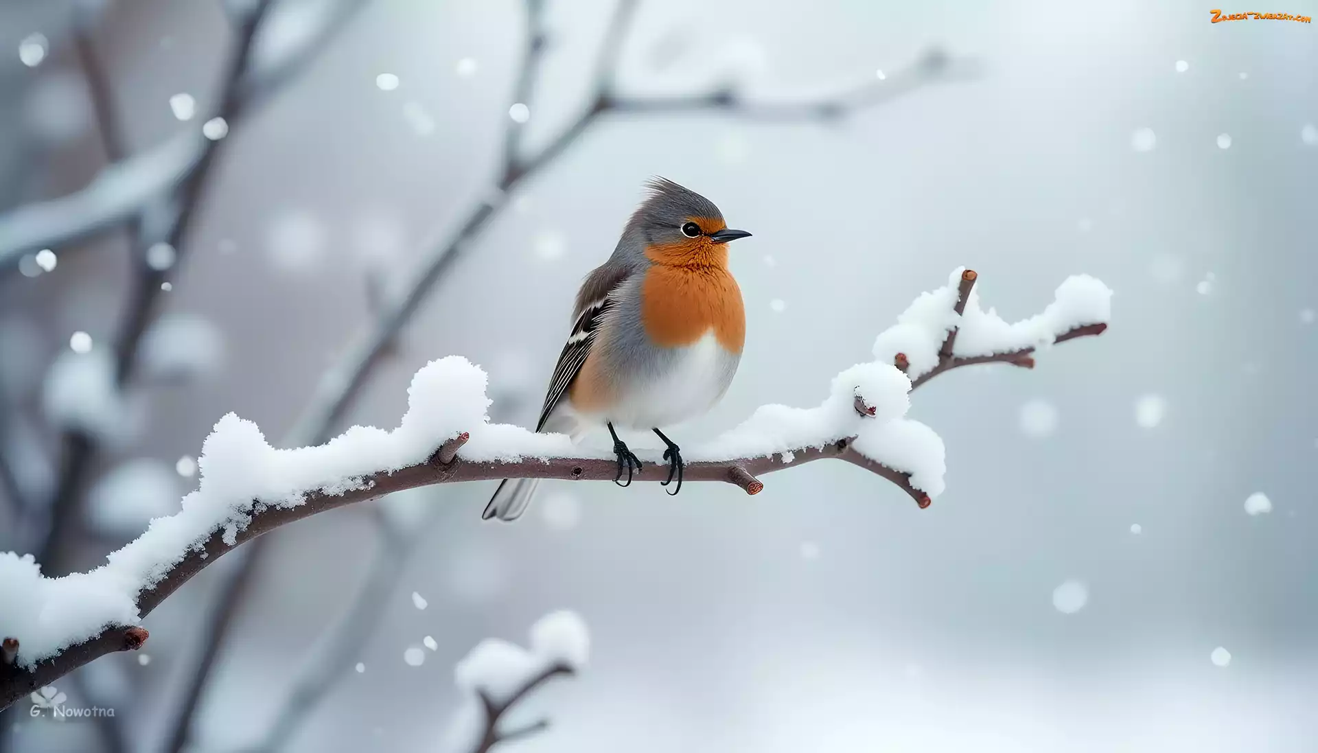 Zdjęcie: Grafika, Ośnieżona, Rudzik, Ptak, Gałązka, Zima