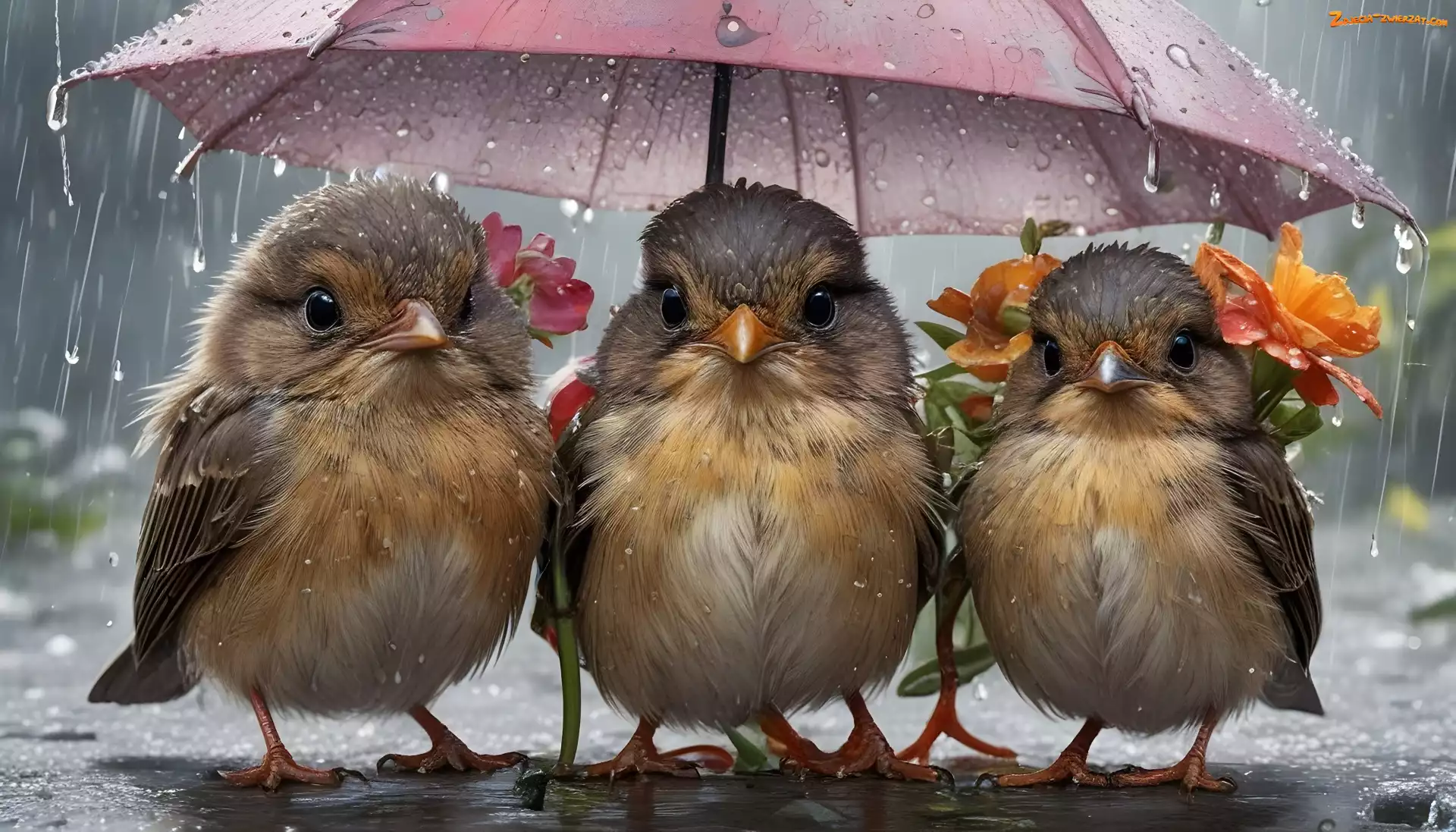 Zdjęcie: Grafika, Kwiaty, Trzy, Ptaki, Parasol, Deszcz