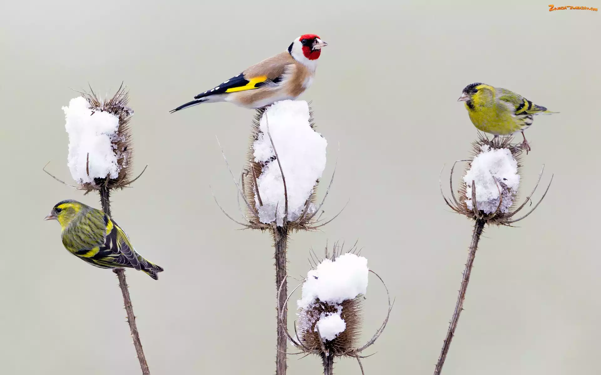 Zdjęcie: Dwa, Ptaki, Śnieg, Roślina, Szczygieł, Czyże zwyczajne