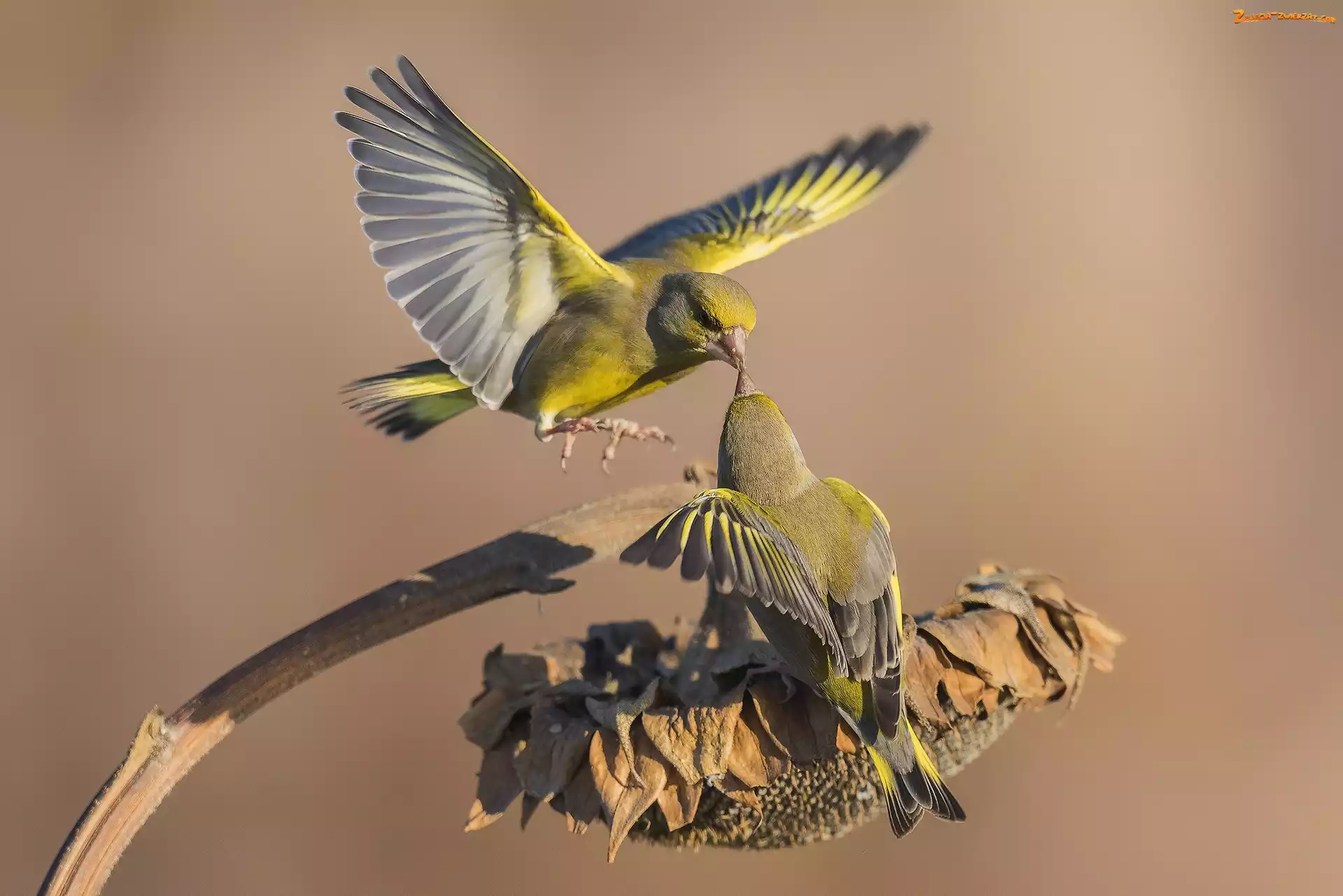 Zdjęcie: Ptaki, Słonecznik, Dwa, Dzwońce zwyczajne