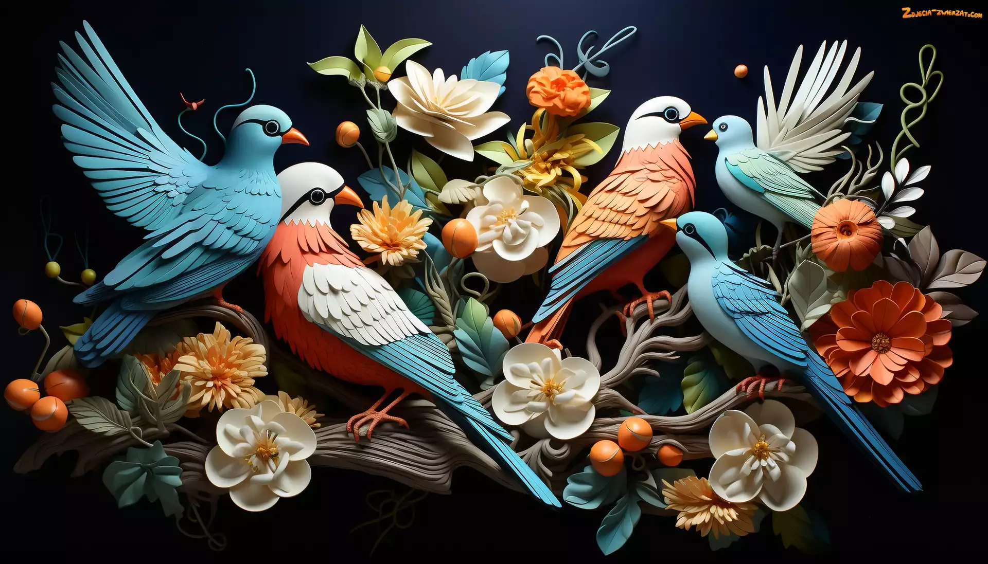 Zdjęcie: Grafika, Kolorowe, Kwiaty, Ptaki