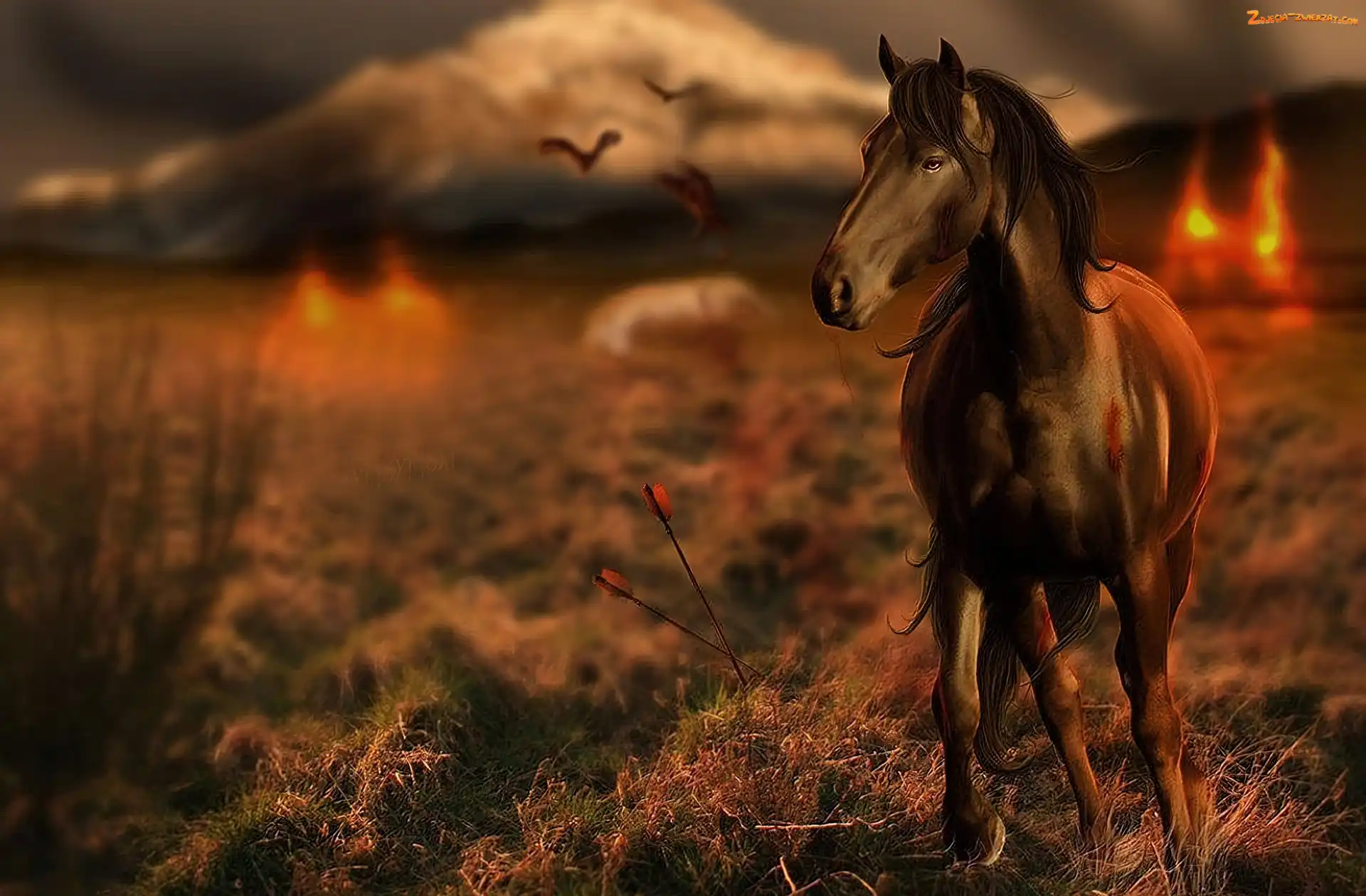 Zdjęcie: Ptaki, Słońca, Łąka, Koń, Zachód