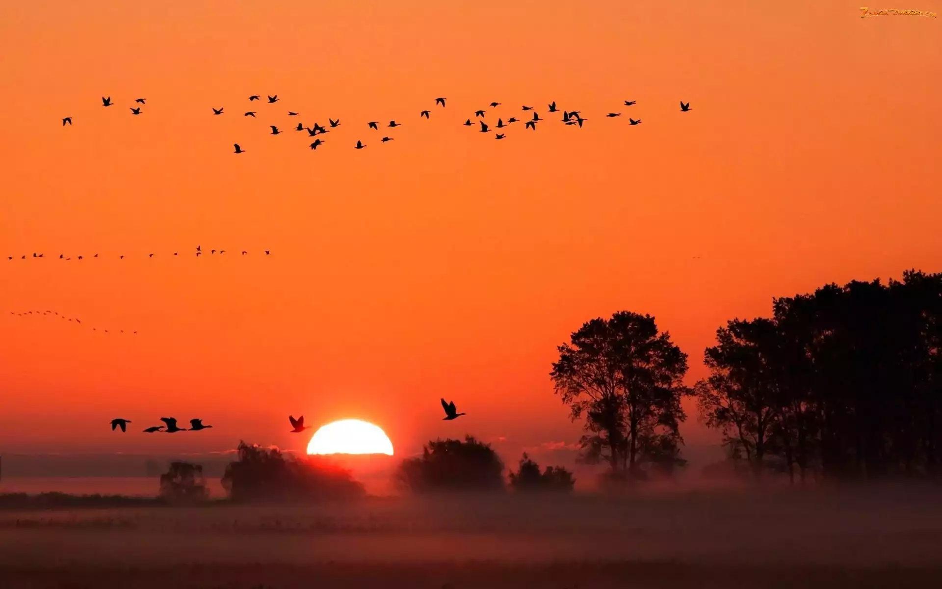 Zdjęcie: Ptaki, Drzewa, Zachód, Mgła, Słońca